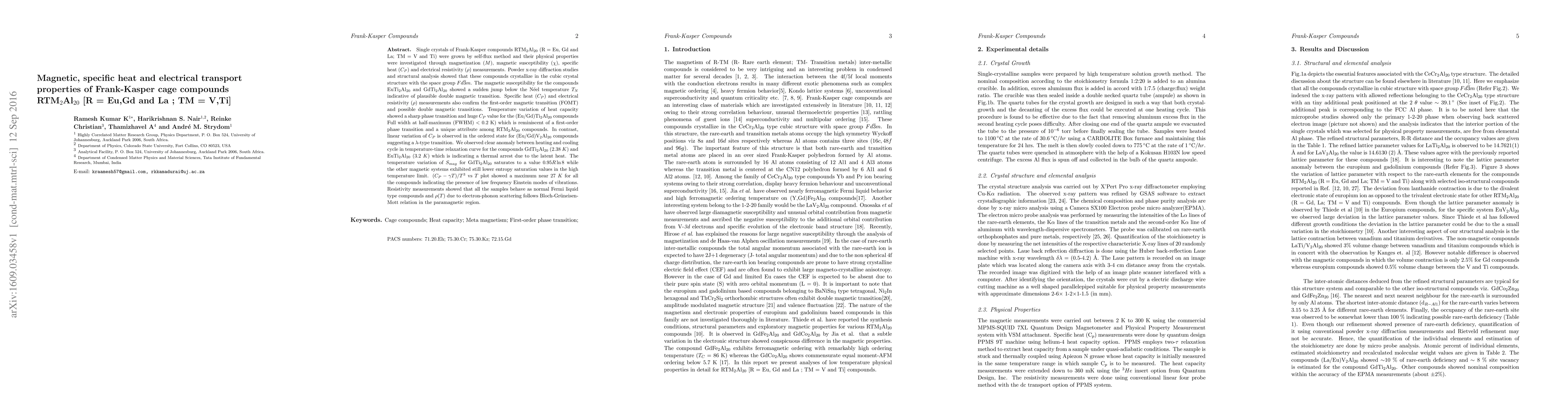 This research investigates the magnetic, thermal, and electrical properties of Frank-Kasper cage compounds RTM2Al20, revealing a possible double magnetic transition and first-order phase transitions with unique heat capacity behavior.