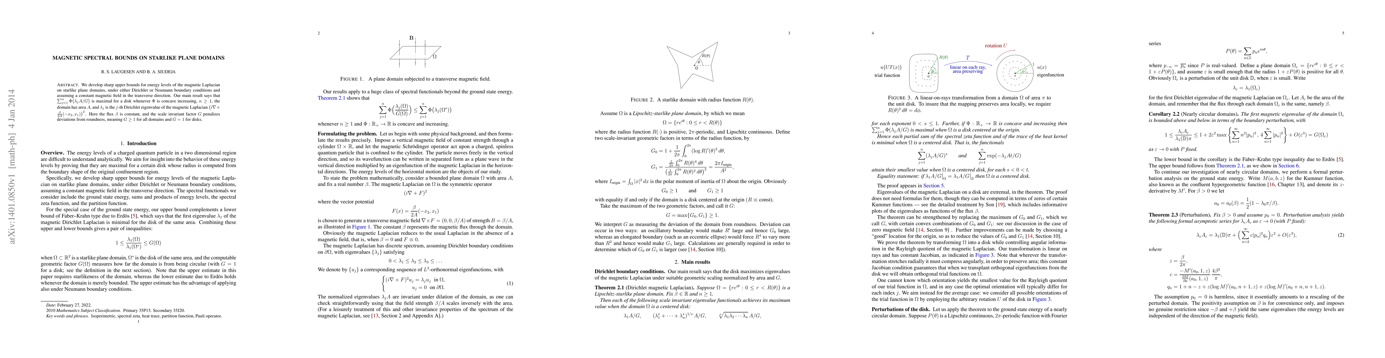 We develop sharp upper bounds for energy levels of the magnetic Laplacian on starlike plane domains, under either Dirichlet or Neumann boundary conditions and assuming a constant magnetic field in the transverse direction. Our main result says that $\sum_{j=1}^n \Phi \big( \lambda_j A/G \big)$ is maximal for a disk whenever $\Phi$ is concave increasing, $n \geq 1$, the domain has area $A$, and $\lambda_j$ is the $j$-th Dirichlet eigenvalue of the magnetic Laplacian $\big( i\nabla+ \frac{\beta}{2A}(-x_2,x_1) \big)^2$. Here the flux $\beta$ is constant, and the scale invariant factor $G$ penalizes deviations from roundness, meaning $G \geq 1$ for all domains and $G=1$ for disks.