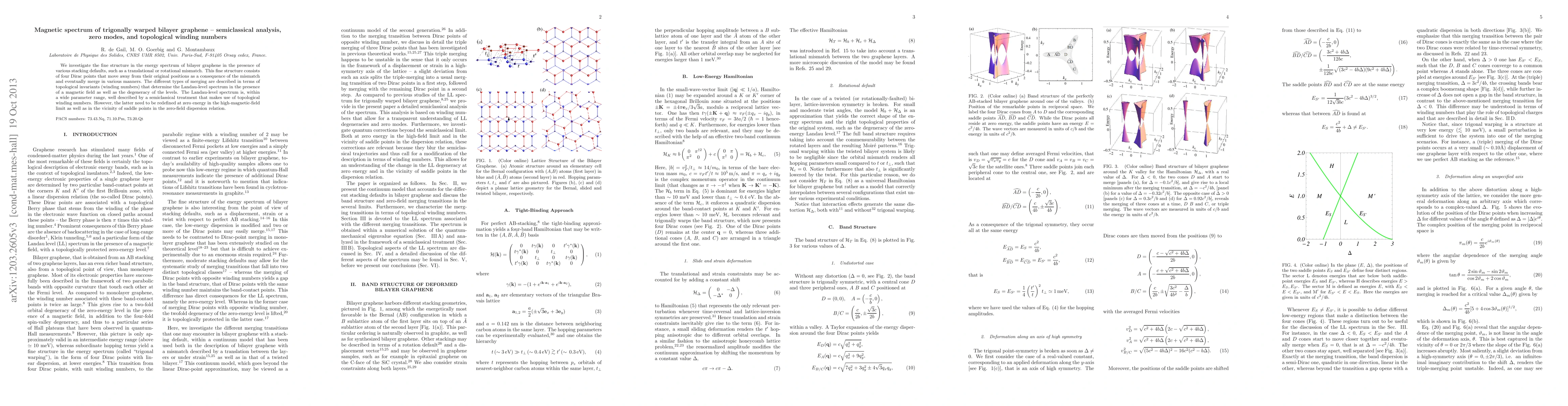 We investigate the fine structure in the energy spectrum of bilayer graphene in the presence of various stacking defaults, such as a translational or rotational mismatch. This fine structure consists of four Dirac points that move away from their original positions as a consequence of the mismatch and eventually merge in various manners. The different types of merging are described in terms of topological invariants (winding numbers) that determine the Landau-level spectrum in the presence of a magnetic field as well as the degeneracy of the levels. The Landau-level spectrum is, within a wide parameter range, well described by a semiclassical treatment that makes use of topological winding numbers. However, the latter need to be redefined at zero energy in the high-magnetic-field limit as well as in the vicinity of saddle points in the zero-field dispersion relation.