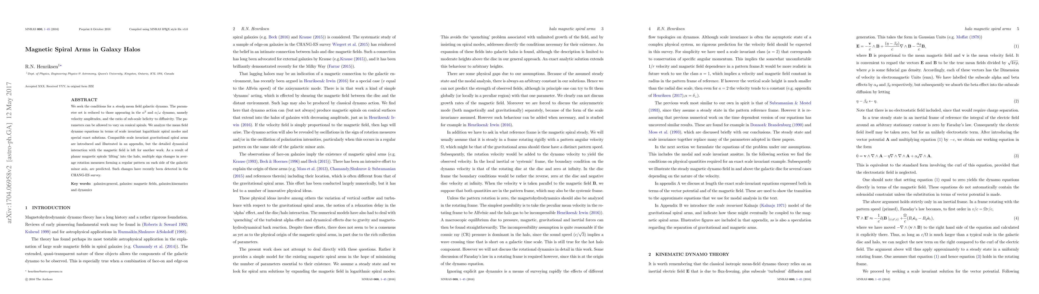 We seek the conditions for a {\it steady} mean field galactic dynamo. The parameter set is reduced to those appearing in the $\alpha^2$ and $\alpha/\omega$ dynamo, namely velocity amplitudes, and the ratio of sub-scale helicity to diffusivity. The parameters can be allowed to vary on conical spirals. We analyze the mean field dynamo equations in terms of scale invariant logarithmic spiral modes and special exact solutions. Compatible scale invariant gravitational spiral arms are introduced and illustrated in an appendix, but the detailed dynamical interaction with the magnetic field is left for another work. As a result of planar magnetic spirals `lifting' into the halo, multiple sign changes in average rotation measures forming a regular pattern on each side of the galactic minor axis, are predicted. Such changes have recently been detected in the CHANG-ES survey.