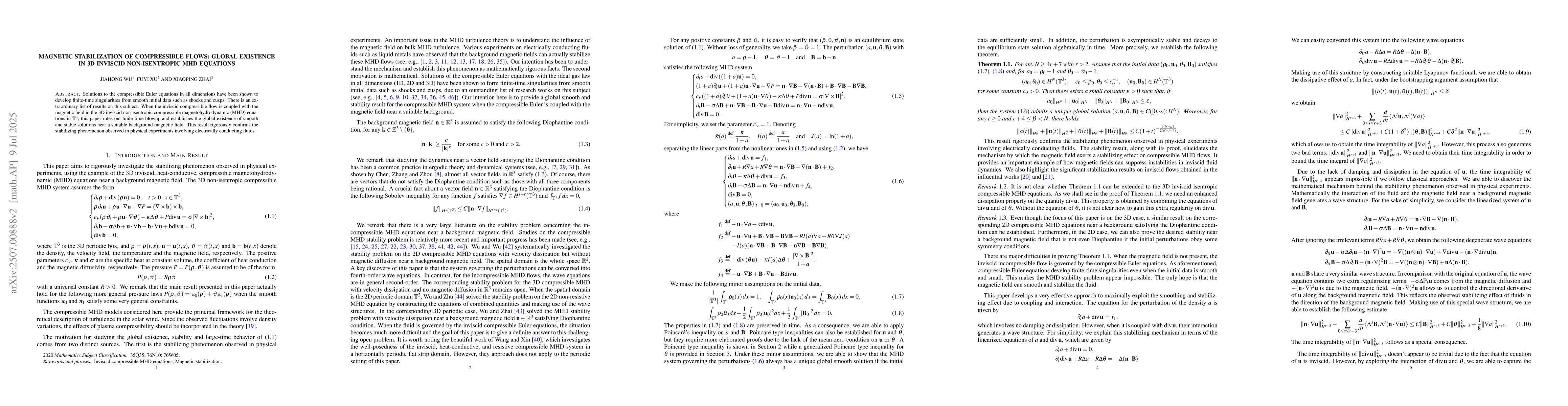 Solutions to the compressible Euler equations in all dimensions have been shown to develop finite-time singularities from smooth initial data such as shocks and cusps. There is an extraordinary list of results on this subject. When the inviscid compressible flow is coupled with the magnetic field in the 3D inviscid non-isentropic compressible magnetohydrodynamic (MHD) equations in $\mathbb{T}^3$, this paper rules out finite-time blowup and establishes the global existence of smooth and stable solutions near a suitable background magnetic field. This result rigorously confirms the stabilizing phenomenon observed in physical experiments involving electrically conducting fluids.