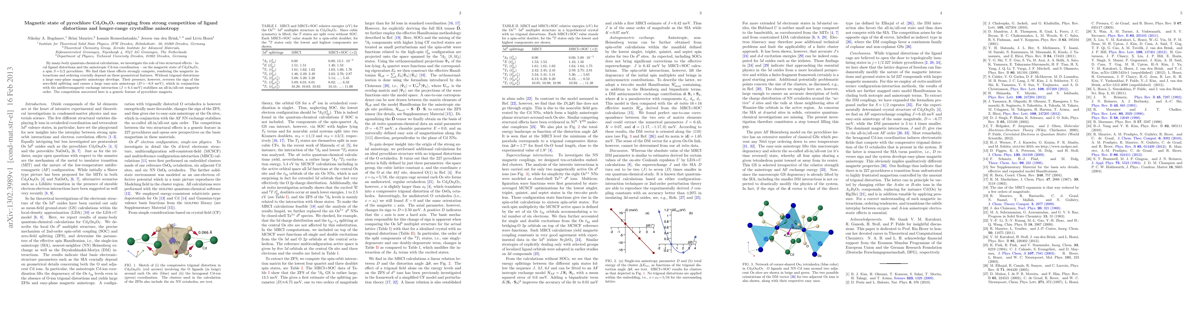 By many-body quantum-chemical calculations, we investigate the role of two structural effects - local ligand distortions and the anisotropic Cd-ion coordination - on the magnetic state of Cd2Os2O7, a spin S=3/2 pyrochlore. We find that these effects strongly compete, rendering the magnetic interactions and ordering crucially depend on these geometrical features. Without trigonal distortions a large easy-plane magnetic anisotropy develops. Their presence, however, reverses the sign of the zero-field splitting and causes a large easy-axis anisotropy (D = -6.8 meV), which in conjunction with the antiferromagnetic exchange interaction (J = 6.4 meV) stabilizes an all-in/all-out magnetic order. The competition uncovered here is a generic feature of pyrochlore magnets.