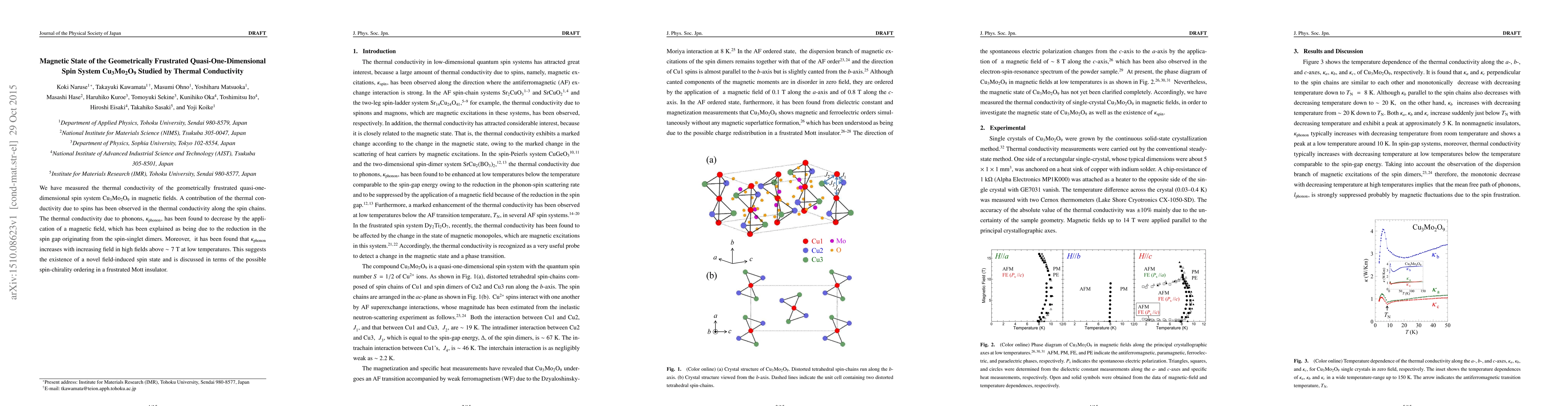 We have measured the thermal conductivity of the geometrically frustrated quasi-onedimensional spin system Cu$_3$Mo$_2$O$_9$ in magnetic fields. A contribution of the thermal conductivity due to spins has been observed in the thermal conductivity along the spin chains. The thermal conductivity due to phonons, $\kappa_{\rm phonon}$, has been found to decrease by the application of a magnetic field, which has been explained as being due to the reduction in the spin gap originating from the spin-singlet dimers. Moreover, it has been found that $\kappa_{\rm phonon}$ increases with increasing field in high fields above ~7 T at low temperatures. This suggests the existence of a novel field-induced spin state and is discussed in terms of the possible spin-chirality ordering in a frustrated Mott insulator.