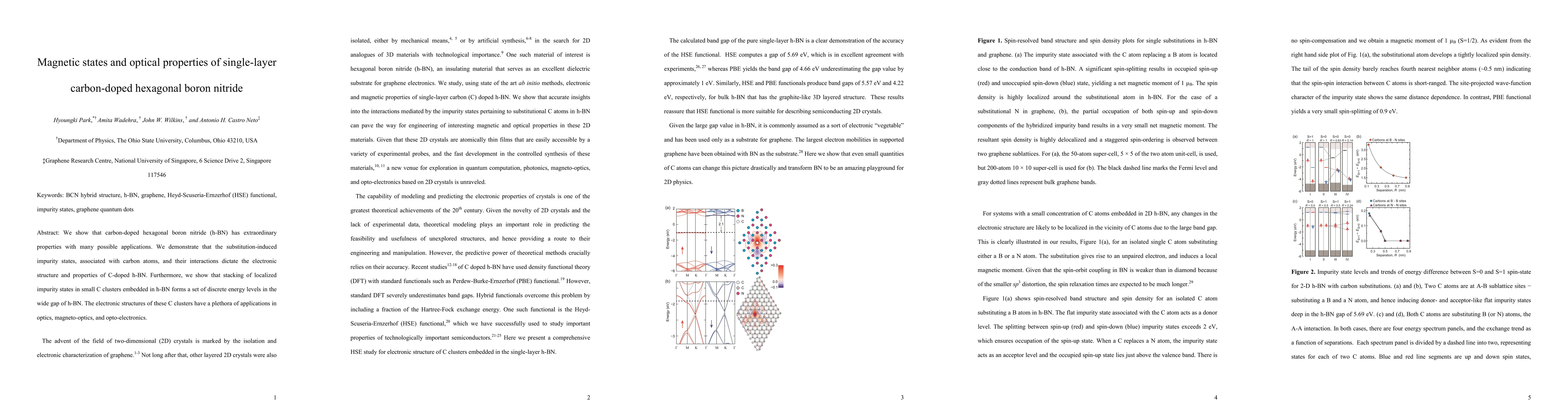 Summary: Carbon-doped hexagonal boron nitride exhibits unique magnetic and optical properties due to substitution-induced impurity states and discrete energy levels formed by small carbon clusters, promising applications in optics and opto-electronics.
