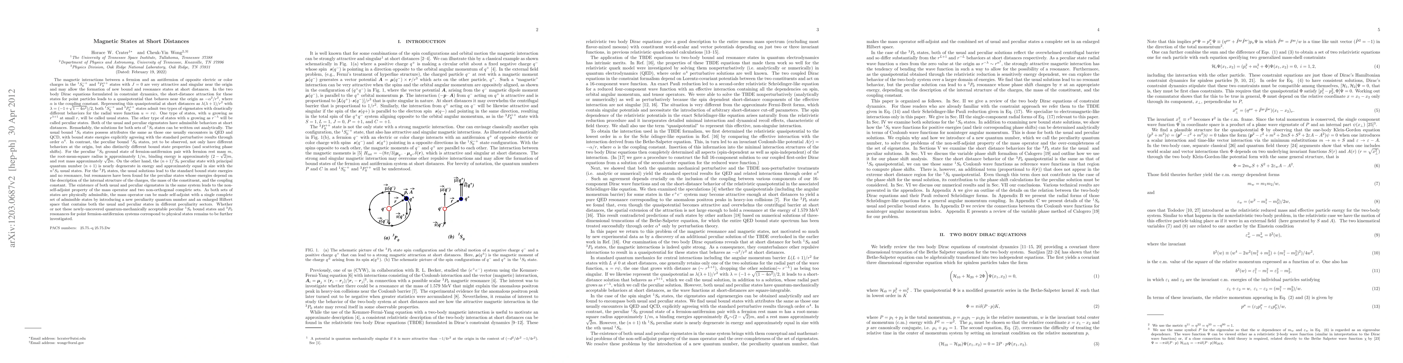 The magnetic interactions between a fermion and an antifermion of opposite electric or color charges in the 1S0 and 3P0 states are very attractive and singular near the origin and may allow the formation of new bound and resonance states at short distances. In the two body Dirac equations formulated in constraint dynamics, the short-distance attraction for these states for point particles leads to a quasipotential that behaves near the origin as -\alpha^2/r^2. Both 1S0 and 3P0 states admit two types of eigenstates with drastically different behaviors for the radial wave function u=r\psi. One type of states, with u growing as r^{1+\sqrt(1-4*\alpha^2)/2} at small r, will be called usual states. The other type of states with u growing as r^{(1-\sqrt(1-4*\alpha^2))/2} will be called peculiar states. Both of the usual and peculiar eigenstates have admissible behaviors at short distances. The usual bound 1S0 states possess attributes the same as those one usually encounters in QED and QCD. In contrast, the peculiar bound 1S0 states, yet to be observed, have distinctly different bound state properties and scattering phase shifts. For the 3P0 states, the usual solutions lead to the standard bound state energies and no resonance, but resonances have been found for the peculiar states whose energies depend on the description of the internal structure of the charges, the mass of the constituent, and the coupling constant. The existence of both usual and peculiar eigenstates in the same system leads to the non-self-adjoint property of the mass operator and two non-orthogonal complete sets. The mass operator can be made self-adjoint with a single complete set of admissible states by introducing a new peculiarity quantum number and an enlarged Hilbert space.