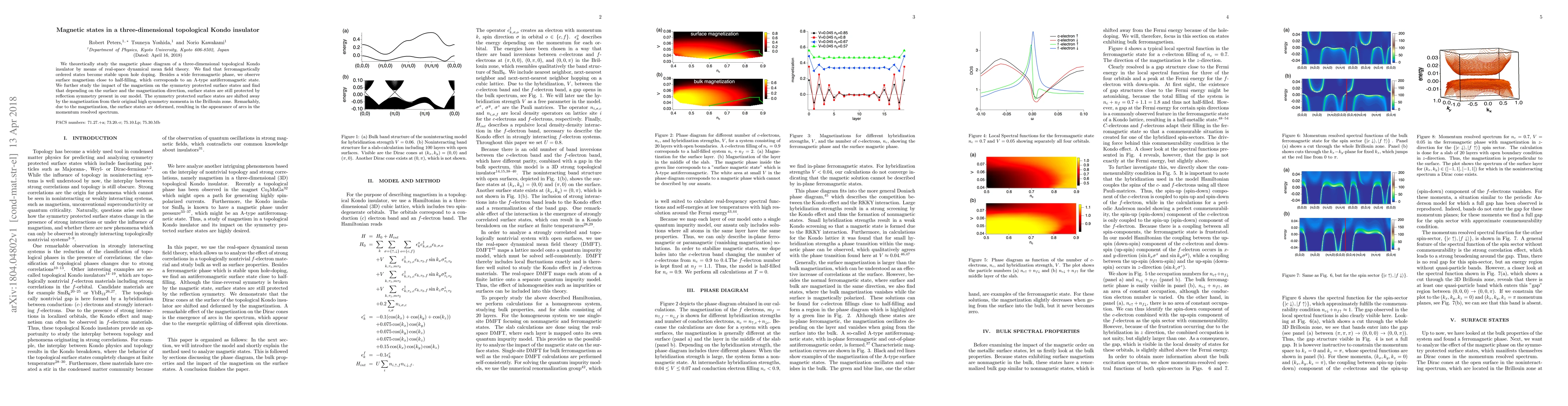We theoretically study the magnetic phase diagram of a three-dimensional topological Kondo insulator by means of real-space dynamical mean field theory. We find that ferromagnetically ordered states become stable upon hole doping. Besides a wide ferromagnetic phase, we observe surface magnetism close to half-filling, which corresponds to an A-type antiferromagnetic state. We further study the impact of the magnetism on the symmetry protected surface states and find that depending on the surface and the magnetization direction, surface states are still protected by reflection symmetry present in our model. The symmetry protected surface states are shifted away by the magnetization from their original high symmetry momenta in the Brillouin zone. Remarkably, due to the magnetization, the surface states are deformed, resulting in the appearance of arcs in the momentum resolved spectrum.