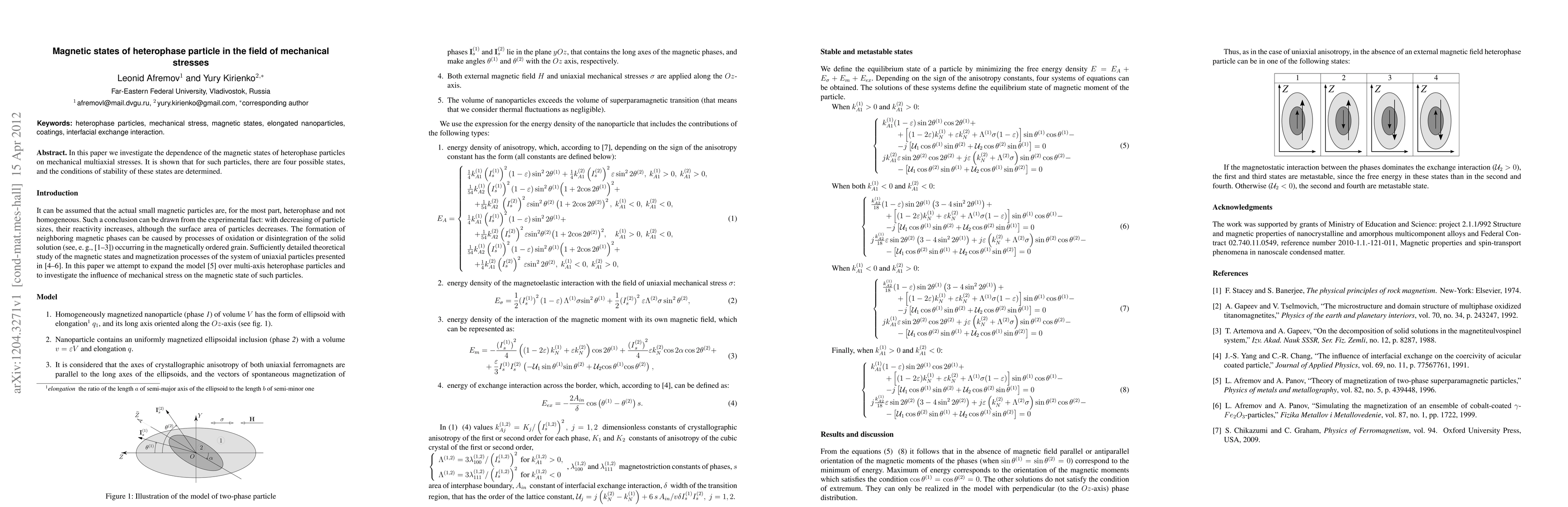 This research identifies four distinct magnetic states of heterophase particles under multiaxial mechanical stresses, determining the conditions for stability of these states.
