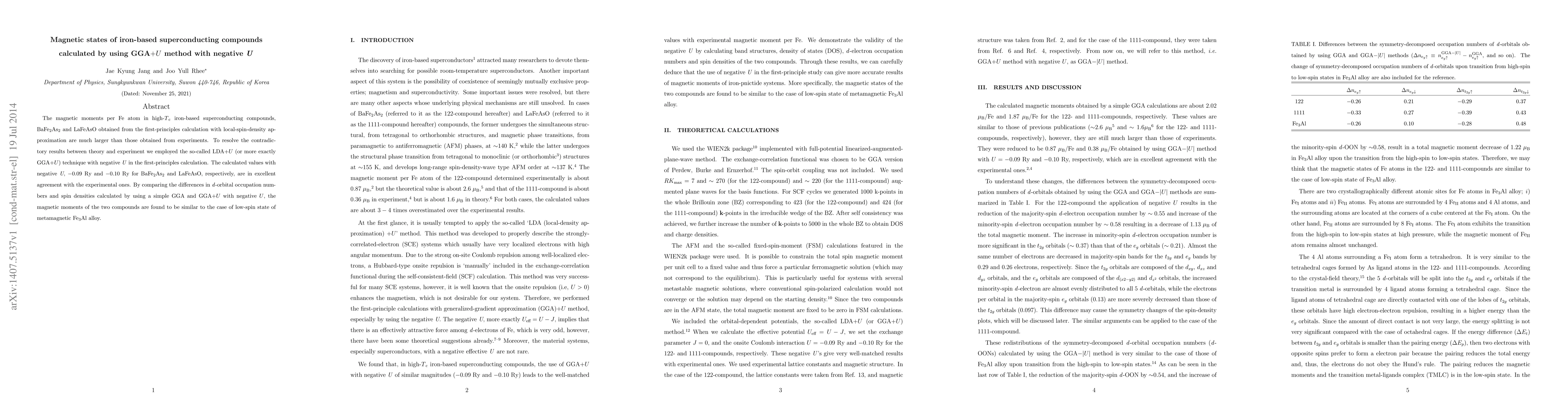 This paper uses GGA$+U$ method with negative $U$ to calculate magnetic moments in iron-based superconductors, BaFe$_{2}$As$_{2}$ and LaFeAsO, resolving discrepancies between theoretical and experimental values. The calculated magnetic moments agree well with experiments, indicating a low-spin state similar to metamagnetic Fe$_{3}$Al alloy.