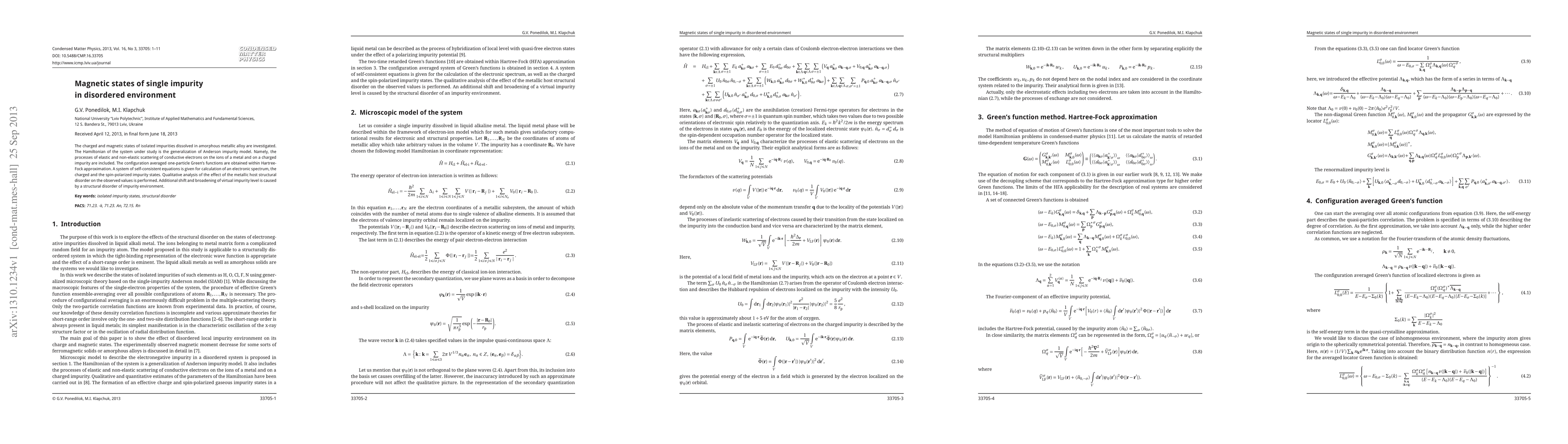 The charged and magnetic states of isolated impurities dissolved in amorphous metallic alloy are investigated. The Hamiltonian of the system under study is the generalization of Anderson impurity model. Namely, the processes of elastic and non-elastic scattering of conductive electrons on the ions of a metal and on a charged impurity are included. The configuration averaged one-particle Green's functions are obtained within Hartree-Fock approximation. A system of self-consistent equations is given for calculation of an electronic spectrum, the charged and the spin-polarized impurity states. Qualitative analysis of the effect of the metallic host structural disorder on the observed values is performed. Additional shift and broadening of virtual impurity level is caused by a structural disorder of impurity environment.