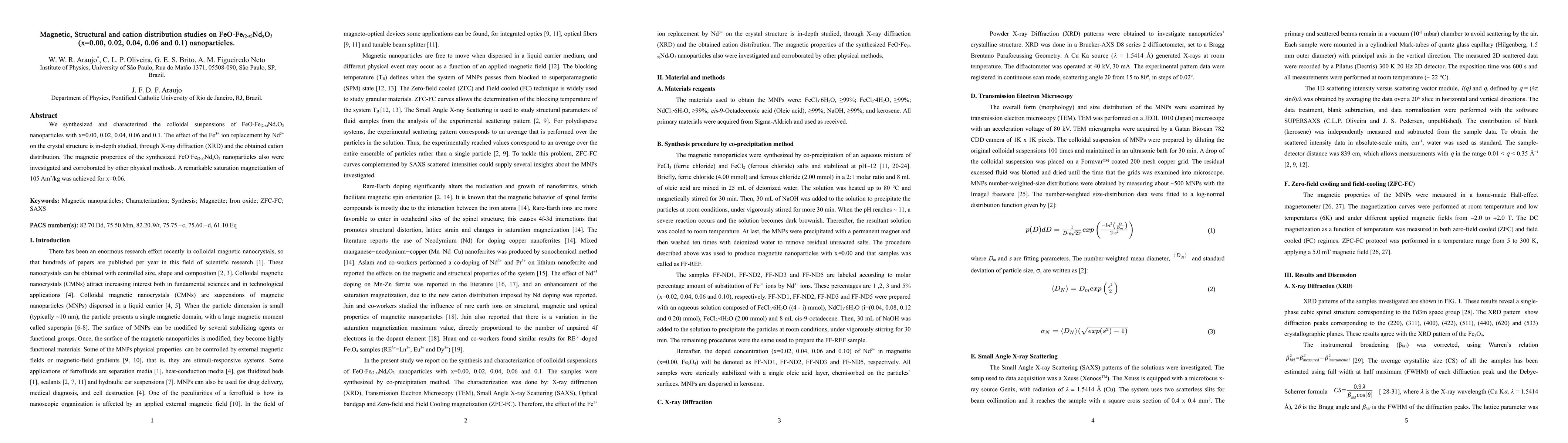 We synthesized and characterized the colloidal suspensions of $FeO \cdot Fe_{(2-x)}Nd_{x}O_{3}$ nanoparticles with $x=0.00, 0.02, 0.04, 0.06 \text{ and }0.1.$ The effect of the $Fe^{3+}$ ion replacement by $Nd^{3+}$ on the crystal structure is in-depth studied, through X-ray diffraction (XRD) and the obtained cation distribution. The magnetic properties of the synthesized $FeO \cdot Fe_{(2-x)}Nd_{x}O_{3}$ nanoparticles also were investigated and corroborated by other physical methods. A remarkable saturation magnetization of 105 $Am^{2}/kg$ was achieved for $x=0.06$.