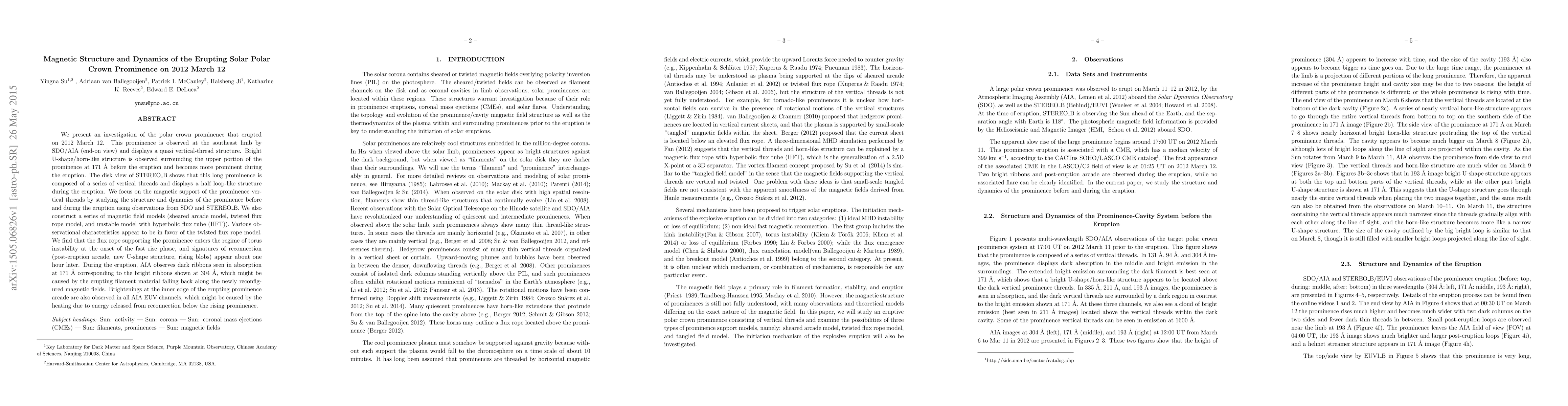 We present an investigation of the polar crown prominence that erupted on 2012 March 12. This prominence is observed at the southeast limb by SDO/AIA (end-on view) and displays a quasi vertical-thread structure. Bright U-shape/horn-like structure is observed surrounding the upper portion of the prominence at 171 angstrom before the eruption and becomes more prominent during the eruption. The disk view of STEREO-B shows that this long prominence is composed of a series of vertical threads and displays a half loop-like structure during the eruption. We focus on the magnetic support of the prominence vertical threads by studying the structure and dynamics of the prominence before and during the eruption using observations from SDO and STEREO-B. We also construct a series of magnetic field models (sheared arcade model, twisted flux rope model, and unstable model with hyperbolic flux tube (HFT)). Various observational characteristics appear to be in favor of the twisted flux rope model. We find that the flux rope supporting the prominence enters the regime of torus instability at the onset of the fast rise phase, and signatures of reconnection (post-eruption arcade, new U-shape structure, rising blobs) appear about one hour later. During the eruption, AIA observes dark ribbons seen in absorption at 171 angstrom corresponding to the bright ribbons shown at 304 angstrom, which might be caused by the erupting filament material falling back along the newly reconfigured magnetic fields. Brightenings at the inner edge of the erupting prominence arcade are also observed in all AIA EUV channels, which might be caused by the heating due to energy released from reconnection below the rising prominence.