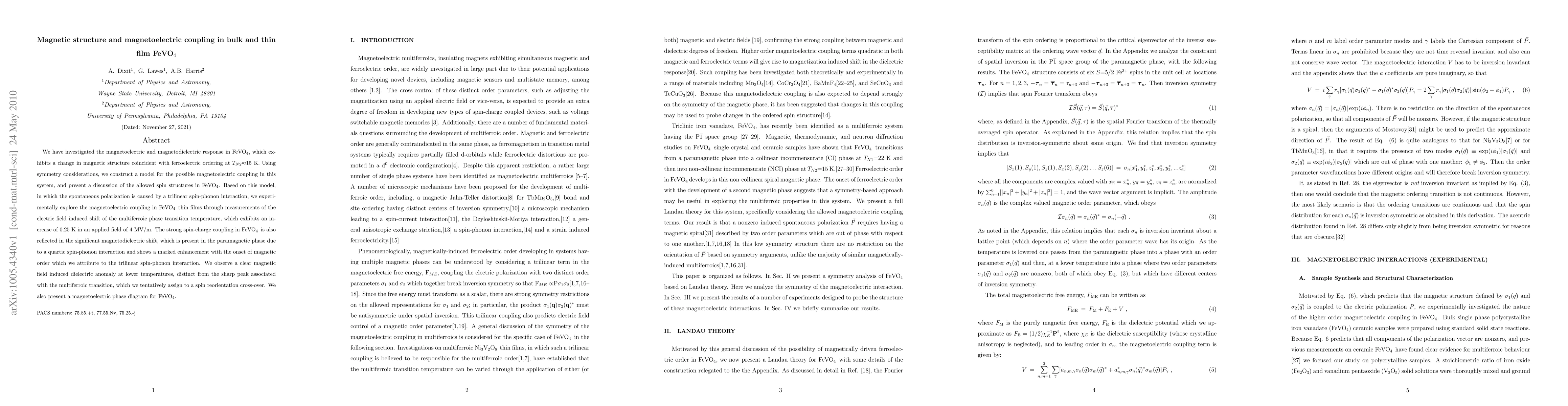 We have investigated the magnetoelectric and magnetodielectric response in FeVO$_4$, which exhibits a change in magnetic structure coincident with ferroelectric ordering at $T_{N2}$$\approx$15 K. Using symmetry considerations, we construct a model for the possible magnetoelectric coupling in this system, and present a discussion of the allowed spin structures in FeVO$_4$. Based on this model, in which the spontaneous polarization is caused by a trilinear spin-phonon interaction, we experimentally explore the magnetoelectric coupling in FeVO$_4$ thin films through measurements of the electric field induced shift of the multiferroic phase transition temperature, which exhibits an increase of 0.25 K in an applied field of 4 MV/m. The strong spin-charge coupling in \fvo\, is also reflected in the significant magnetodielectric shift, which is present in the paramagnetic phase due to a quartic spin-phonon interaction and shows a marked enhancement with the onset of magnetic order which we attribute to the trilinear spin-phonon interaction. We observe a clear magnetic field induced dielectric anomaly at lower temperatures, distinct from the sharp peak associated with the multiferroic transition, which we tentatively assign to a spin reorientation cross-over. We also present a magnetoelectric phase diagram for FeVO$_4$.