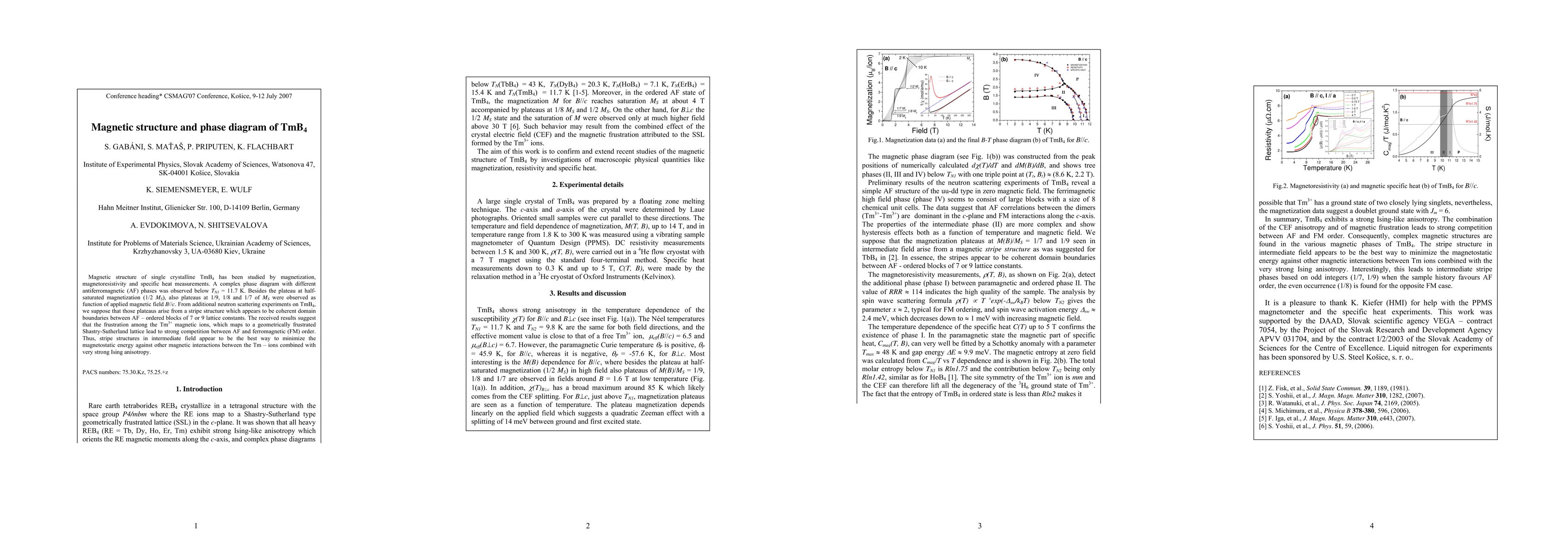 Magnetic structure of single crystalline TmB4 has been studied by magnetization, magnetoresistivity and specific heat measurements. A complex phase diagram with different antiferromagnetic (AF) phases was observed below TN1 = 11.7 K. Besides the plateau at half-saturated magnetization (1/2 MS), also plateaus at 1/9, 1/8 and 1/7 of MS were observed as function of applied magnetic field B//c. From additional neutron scattering experiments on TmB4, we suppose that those plateaus arise from a stripe structure which appears to be coherent domain boundaries between AF ordered blocks of 7 or 9 lattice constants. The received results suggest that the frustration among the Tm3+ magnetic ions, which maps to a geometrically frustrated Shastry-Sutherland lattice lead to strong competition between AF and ferromagnetic (FM) order. Thus, stripe structures in intermediate field appear to be the best way to minimize the magnetostatic energy against other magnetic interactions between the Tm ions combined with very strong Ising anisotropy.