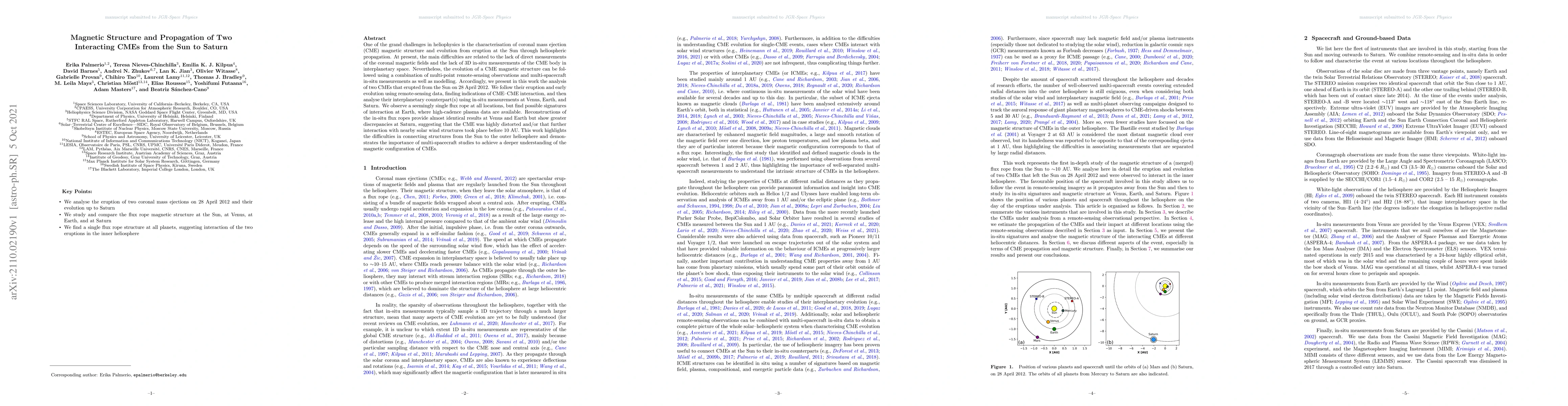 One of the grand challenges in heliophysics is the characterisation of coronal mass ejection (CME) magnetic structure and evolution from eruption at the Sun through heliospheric propagation. At present, the main difficulties are related to the lack of direct measurements of the coronal magnetic fields and the lack of 3D in-situ measurements of the CME body in interplanetary space. Nevertheless, the evolution of a CME magnetic structure can be followed using a combination of multi-point remote-sensing observations and multi-spacecraft in-situ measurements as well as modelling. Accordingly, we present in this work the analysis of two CMEs that erupted from the Sun on 28 April 2012. We follow their eruption and early evolution using remote-sensing data, finding indications of CME--CME interaction, and then analyse their interplanetary counterpart(s) using in-situ measurements at Venus, Earth, and Saturn. We observe a seemingly single flux rope at all locations, but find possible signatures of interaction at Earth, where high-cadence plasma data are available. Reconstructions of the in-situ flux ropes provide almost identical results at Venus and Earth but show greater discrepancies at Saturn, suggesting that the CME was highly distorted and/or that further interaction with nearby solar wind structures took place before 10 AU. This work highlights the difficulties in connecting structures from the Sun to the outer heliosphere and demonstrates the importance of multi-spacecraft studies to achieve a deeper understanding of the magnetic configuration of CMEs.