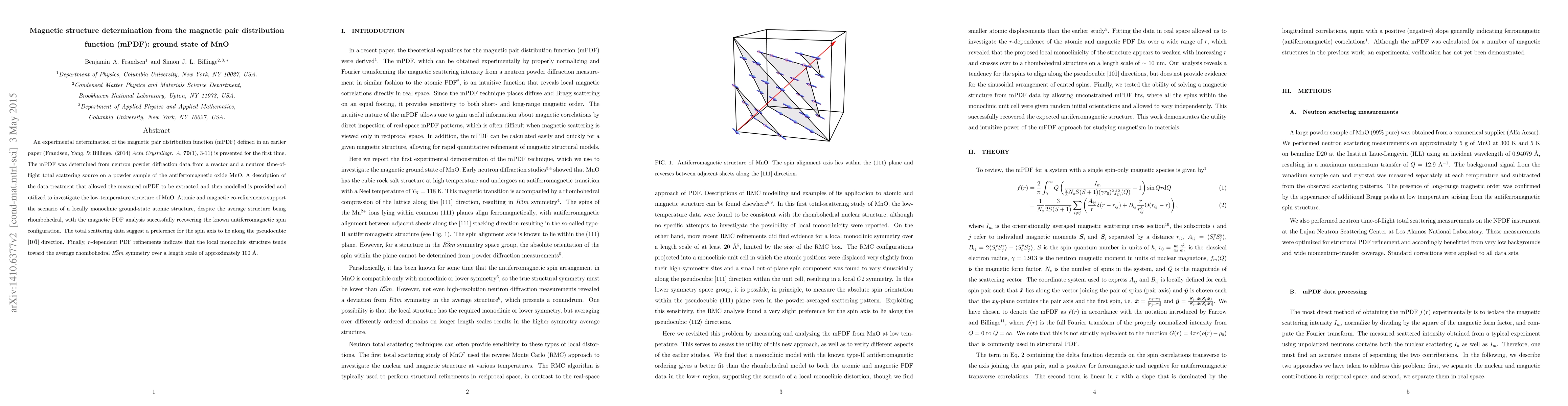 An experimental determination of the magnetic pair distribution function (mPDF) defined in an earlier paper (Frandsen, Yang, and Billinge. (2014) Acta Crystallogr. A, 70(1), 3-11) is presented for the first time. The mPDF was determined from neutron powder diffraction data from a reactor and a neutron time-of-flight total scattering source on a powder sample of the antiferromagnetic oxide MnO. A description of the data treatment that allowed the measured mPDF to be extracted and then modelled is provided and utilized to investigate the low-temperature structure of MnO. Atomic and magnetic co-refinements support the scenario of a locally monoclinic ground-state atomic structure, despite the average structure being rhombohedral, with the magnetic PDF analysis successfully recovering the known antiferromagnetic spin configuration. The total scattering data suggest a preference for the spin axis to lie along the pseudocubic [10$\bar{1}$] direction. Finally, $r$-dependent PDF refinements indicate that the local monoclinic structure tends toward the average rhombohedral $R\overline{3}m$ symmetry over a length scale of approximately 100~\AA.