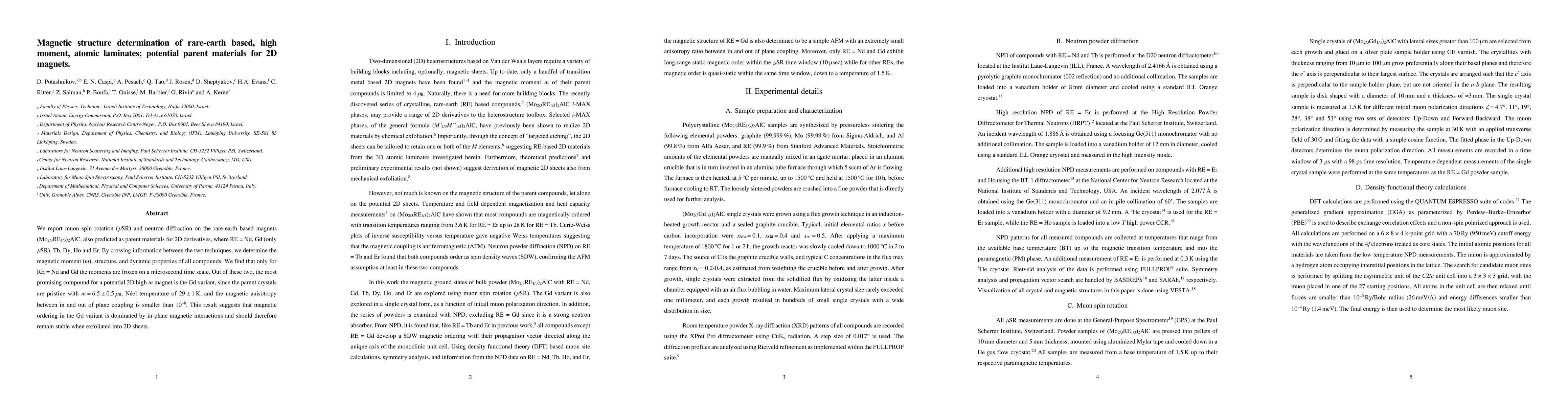 The study uses muon spin rotation and neutron diffraction to analyze rare-earth magnets (Mo2/3RE1/3)2AlC, identifying Gd variant as a promising candidate for 2D high-moment magnets due to its large magnetic moment, low Néel temperature, and weak magnetic anisotropy, suggesting stability when exfoliated into 2D sheets.