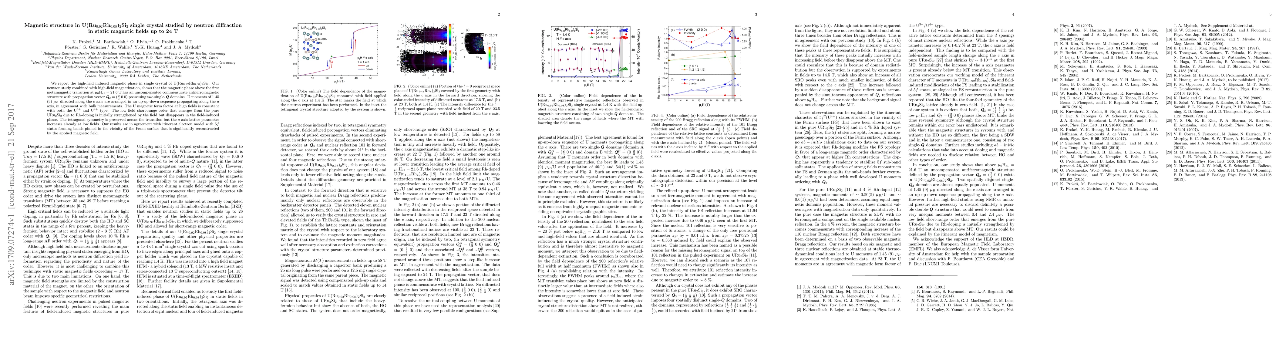 We report the high-field induced magnetic phase in single crystal of U(Ru0.92Rh0.08)2Si2. Our neutron study combined with high-field magnetization, shows that the magnetic phase above the first metamagnetic transition at Hc1 = 21.6 T has an uncompensated commensurate antiferromagnetic structure with propagation vector Q2 = ( 2/3 0 0) possessing two single-Q domains. U moments of 1.45 (9) muB directed along the c axis are arranged in an up-up-down sequence propagating along the a axis, in agreement with bulk measurements. The U magnetic form factor at high fields is consistent with both the U3+ and U4+ type. The low field short-range order that emerges from the pure URu2Si2 due to Rh-doping is initially strengthened by the field but disappears in the field-induced phase. The tetragonal symmetry is preserved across the transition but the a axis lattice parameter increases already at low fields. Our results are in agreement with itinerant electron model with 5f states forming bands pinned in the vicinity of the Fermi surface that is significantly reconstructed by the applied magnetic field.