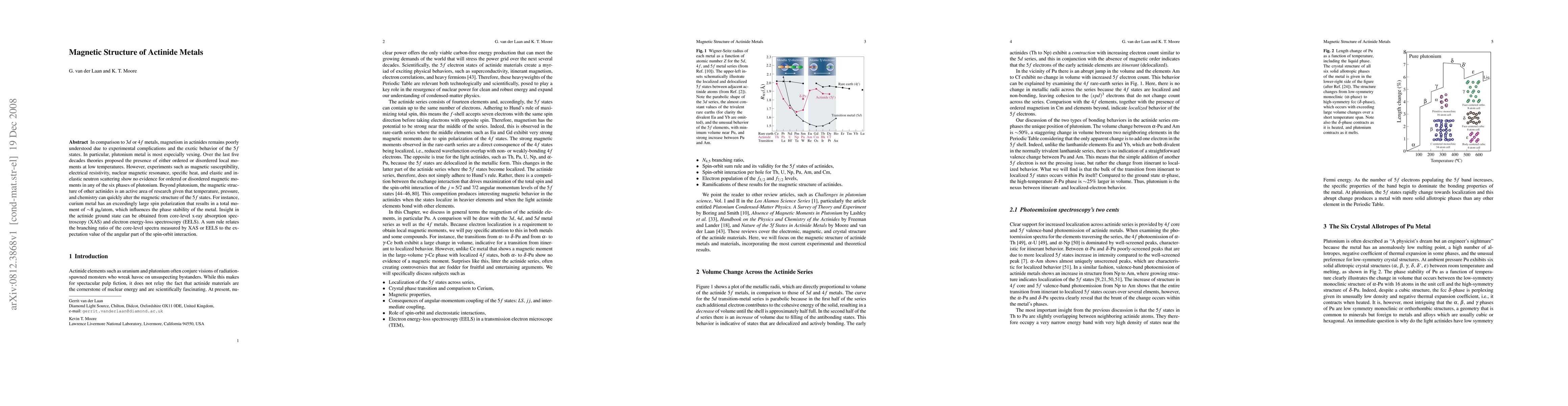 In comparison to 3d or 4f metals, magnetism in actinides remains poorly understood due to experimental complications and the exotic behavior of the 5f states. In particular, plutonium metal is most especially vexing. Over the last five decades theories proposed the presence of either ordered or disordered local moments at low temperatures. However, experiments such as magnetic susceptibility, electrical resistivity, nuclear magnetic resonance, specific heat, and elastic and inelastic neutron scattering show no evidence for ordered or disordered magnetic moments in any of the six phases of plutonium. Beyond plutonium, the magnetic structure of other actinides is an active area of research given that temperature, pressure, and chemistry can quickly alter the magnetic structure of the 5f states. For instance, curium metal has an exceedingly large spin polarization that results in a total moment of about 8 Bohr magneton/atom, which influences the phase stability of the metal. Insight in the actinide ground state can be obtained from core-level x-ray absorption spectroscopy (XAS) and electron energy-loss spectroscopy (EELS). A sum rule relates the branching ratio of the core-level spectra measured by XAS or EELS to the expectation value of the angular part of the spin-orbit interaction.