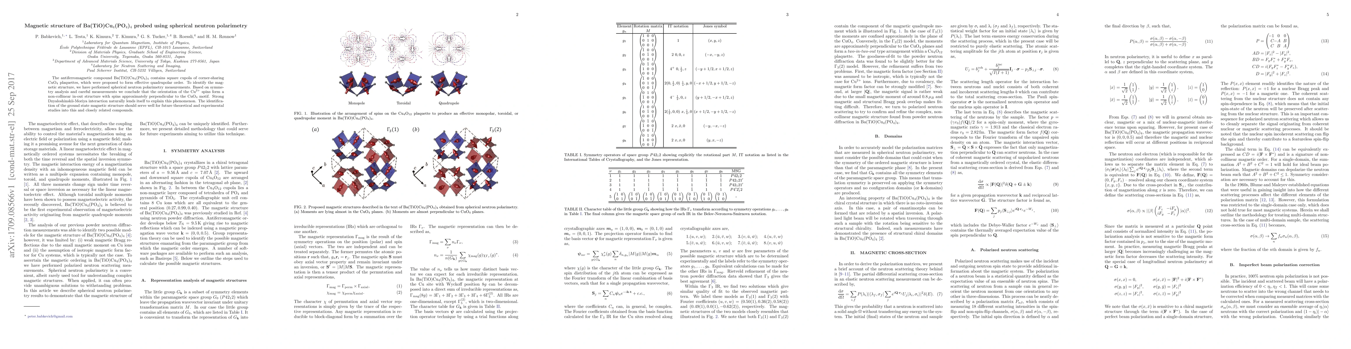 The antiferromagnetic compound Ba(TiO)Cu$_4$(PO$_4$)$_4$ contains square cupola of corner-sharing CuO$_4$ plaquettes, which were proposed to form effective quadrupolar order. To identify the magnetic structure, we have performed spherical neutron polarimetry measurements. Based on symmetry analysis and careful measurements we conclude that the orientation of the Cu$^{2+}$ spins form a non-collinear in-out structure with spins approximately perpendicular to the CuO$_4$ motif. Strong Dzyaloshinskii-Moriya interaction naturally lends itself to explain this phenomenon. The identification of the ground state magnetic structure should serve well for future theoretical and experimental studies into this and closely related compounds.