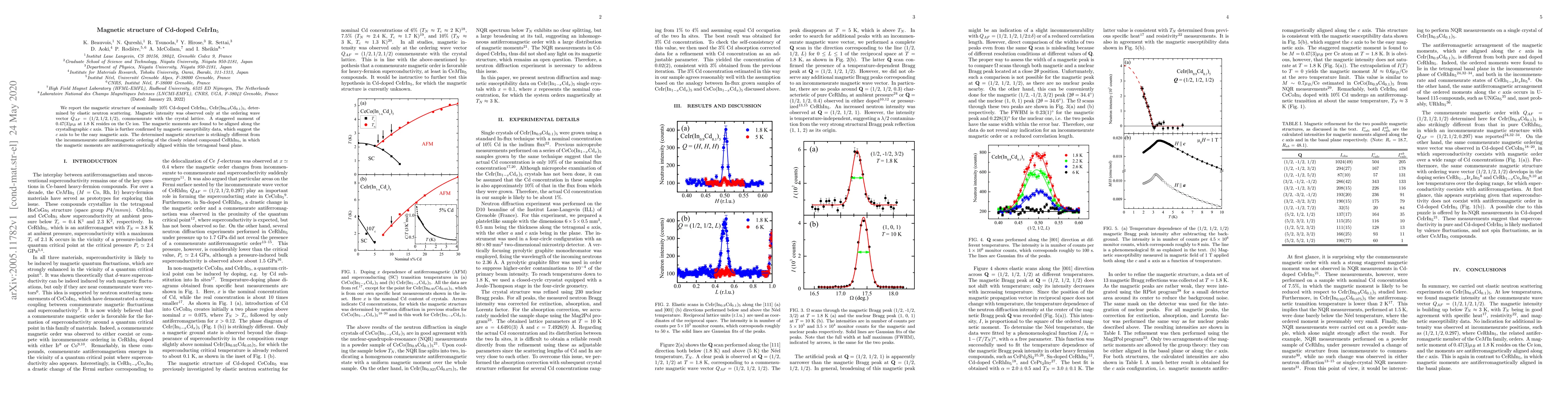 We report the magnetic structure of nominally 10% Cd-doped CeIrIn$_5$, CeIr(In$_{0.9}$Cd$_{0.1}$)$_5$, determined by elastic neutron scattering. Magnetic intensity was observed only at the ordering wave vector $Q_{AF} = (1/2,1/2,1/2)$, commensurate with the crystal lattice. A staggered moment of 0.47(3)$\mu_B$ at 1.8 K resides on the Ce ion. The magnetic moments are found to be aligned along the crystallographic $c$ axis. This is further confirmed by magnetic susceptibility data, which suggest the $c$ axis to be the easy magnetic axis. The determined magnetic structure is strikingly different from the incommensurate antiferromagnetic ordering of the closely related compound CeRhIn$_5$, in which the magnetic moments are antiferromagnetically aligned within the tetragonal basal plane.