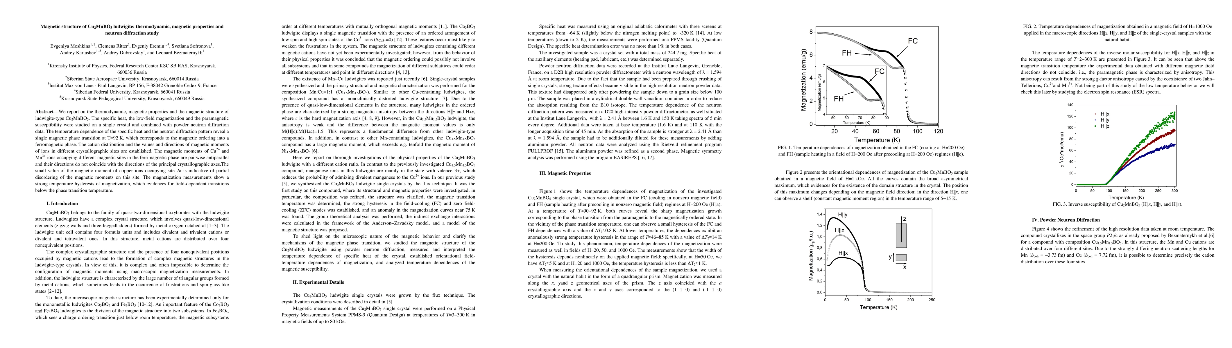 This study investigates Cu2MnBO5 ludwigite, revealing a single magnetic phase transition at 92K into a ferromagnetic phase. Utilizing specific heat, magnetization, susceptibility, and neutron diffraction data, researchers determined cation distribution and magnetic moment directions, noting antiparallel moments of Cu2+ and Mn3+ ions in distinct sites, along with partial disordering of copper moments on site 2a. Magnetization measurements displayed strong temperature hysteresis, suggesting field-dependent transitions below the phase transition temperature.
