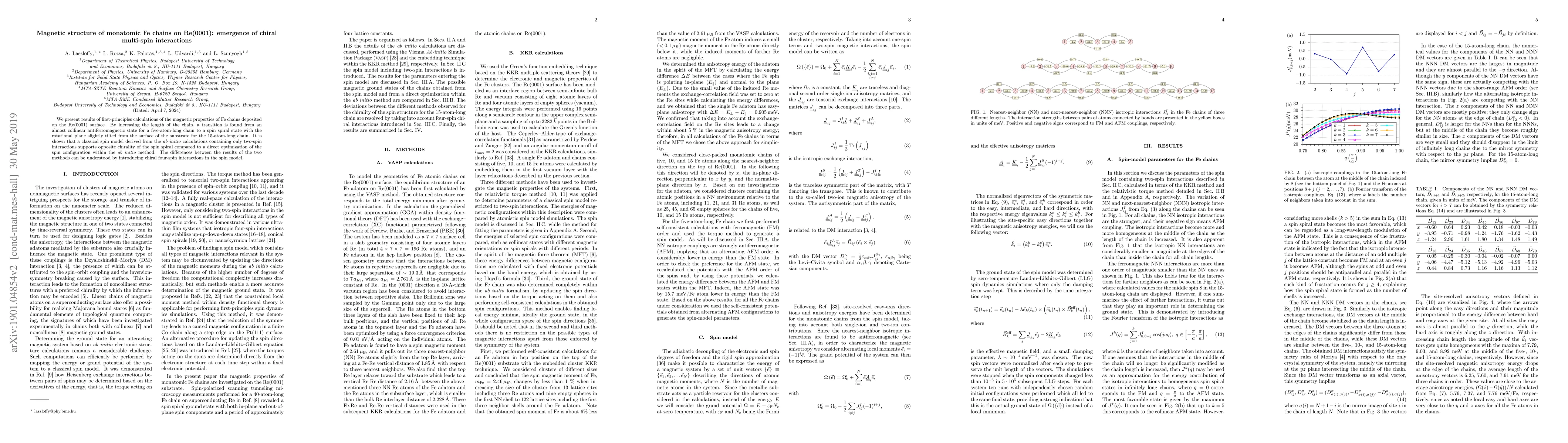 We present results of first-principles calculations of the magnetic properties of Fe chains deposited on the Re(0001) surface. By increasing the length of the chain, a transition is found from an almost collinear antiferromagnetic state for a 5-atom-long chain to a spin spiral state with the rotational plane slightly tilted from the surface of the substrate for the 15-atom-long chain. It is shown that a classical spin model derived from the ab initio calculations containing only two-spin interactions supports opposite chirality of the spin spiral compared to a direct optimization of the spin configuration within the ab initio method. The differences between the results of the two methods can be understood by introducing chiral four-spin interactions in the spin model.