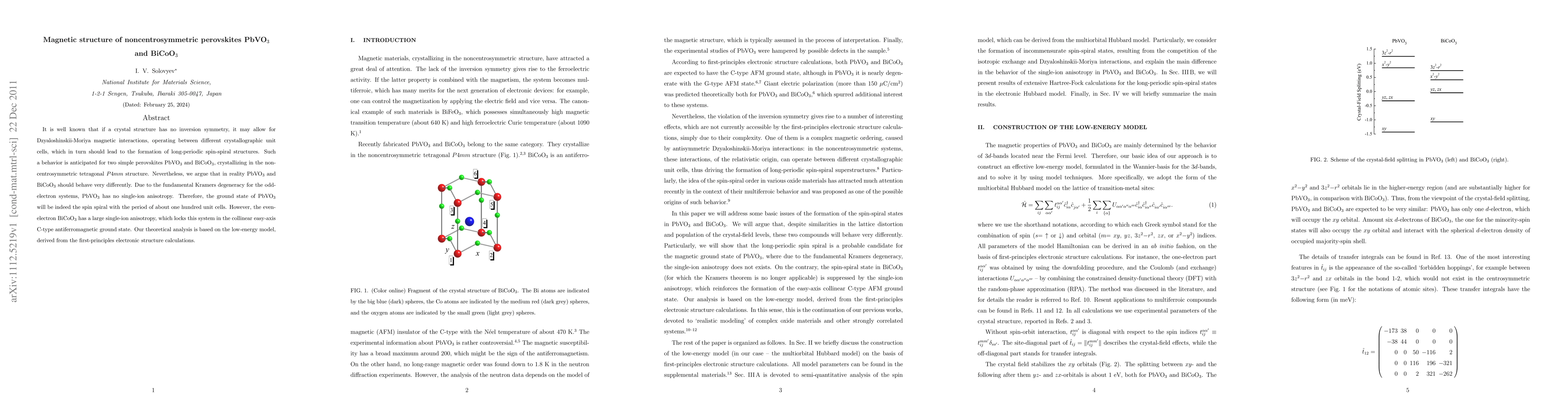 It is well known that if a crystal structure has no inversion symmetry, it may allow for Dzyaloshinskii-Moriya magnetic interactions, operating between different crystallographic unit cells, which in turn should lead to the formation of long-periodic spin-spiral structures. Such a behavior is anticipated for two simple perovskites PbVO3 and BiCoO3, crystallizing in the noncentrosymmetric tetragonal P4mm structure. Nevertheless, we argue that in reality PbVO3 and BiCoO3 should behave very differently. Due to the fundamental Kramers degeneracy for the odd-electron systems, PbVO3 has no single-ion anisotropy. Therefore, the ground state of PbVO3 will be indeed the spin spiral with the period of about one hundred unit cells. However, the even-electron BiCoO3 has a large single-ion anisotropy, which locks this system in the collinear easy-axis C-type antiferromagnetic ground state. Our theoretical analysis is based on the low-energy model, derived from the first-principles electronic structure calculations.