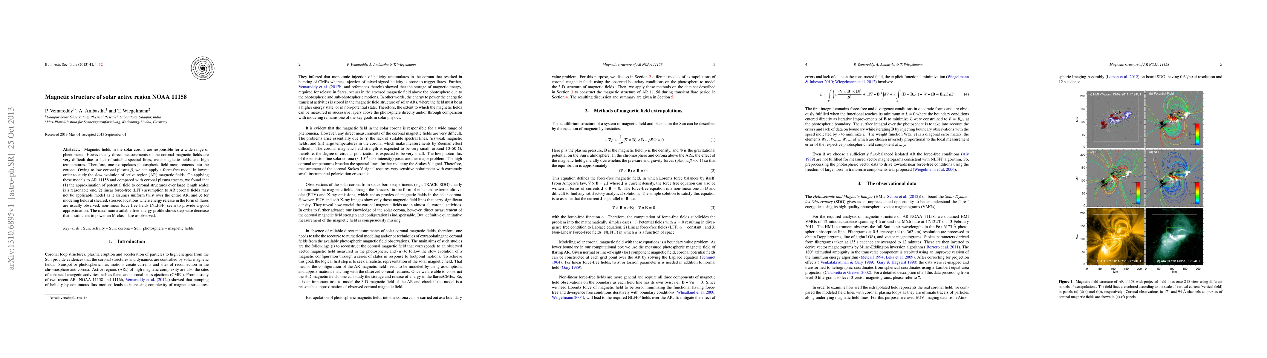 This study uses force-free models to analyze the magnetic structure of solar active region NOAA 11158, finding that potential field approximations work well on large scales, while linear force-free assumptions fail for uniform twists, and non-linear force-free fields better model sheared regions where flares occur. The free-energy profile suggests sufficient energy for an M-class flare.