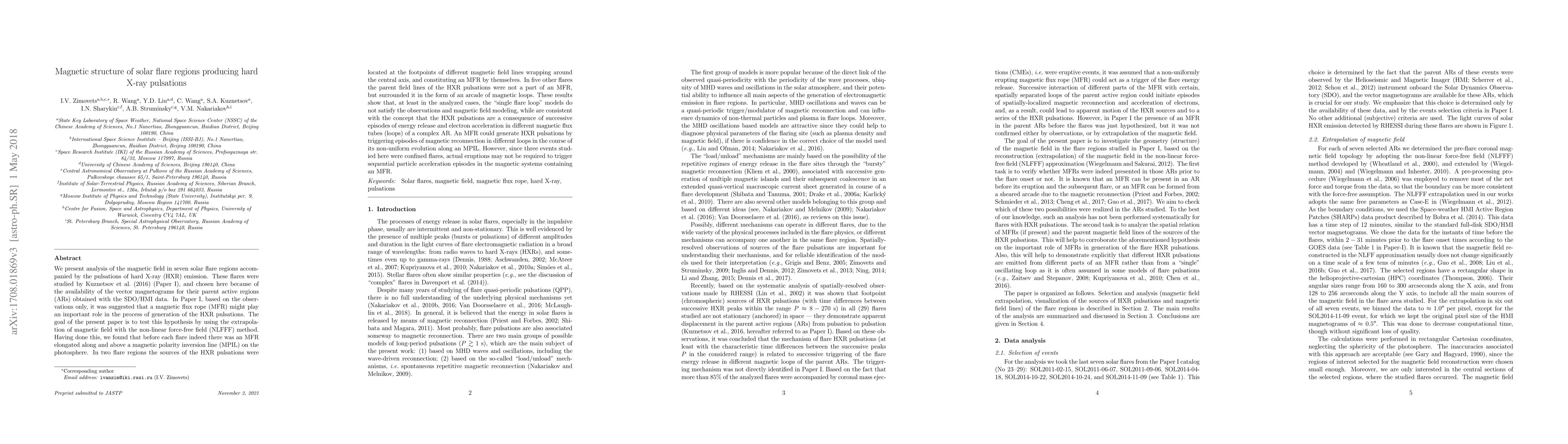 We present analysis of the magnetic field in seven solar flare regions accompanied by the pulsations of hard X-ray (HXR) emission. These flares were studied by Kuznetsov et al. (2016) (Paper~I), and chosen here because of the availability of the vector magnetograms for their parent active regions (ARs) obtained with the SDO/HMI data. In Paper~I, based on the observations only, it was suggested that a magnetic flux rope (MFR) might play an important role in the process of generation of the HXR pulsations. The goal of the present paper is to test this hypothesis by using the extrapolation of magnetic field with the non-linear force-free field (NLFFF) method. Having done this, we found that before each flare indeed there was an MFR elongated along and above a magnetic polarity inversion line (MPIL) on the photosphere. In two flare regions the sources of the HXR pulsations were located at the footpoints of different magnetic field lines wrapping around the central axis, and constituting an MFR by themselves. In five other flares the parent field lines of the HXR pulsations were not a part of an MFR, but surrounded it in the form of an arcade of magnetic loops. These results show that, at least in the analyzed cases, the "single flare loop" models do not satisfy the observations and magnetic field modeling, while are consistent with the concept that the HXR pulsations are a consequence of successive episodes of energy release and electron acceleration in different magnetic flux tubes (loops) of a complex AR. An MFR could generate HXR pulsations by triggering episodes of magnetic reconnection in different loops in the course of its non-uniform evolution along an MPIL. However, since three events studied here were confined flares, actual eruptions may not be required to trigger sequential particle acceleration episodes in the magnetic systems containing an MFR.