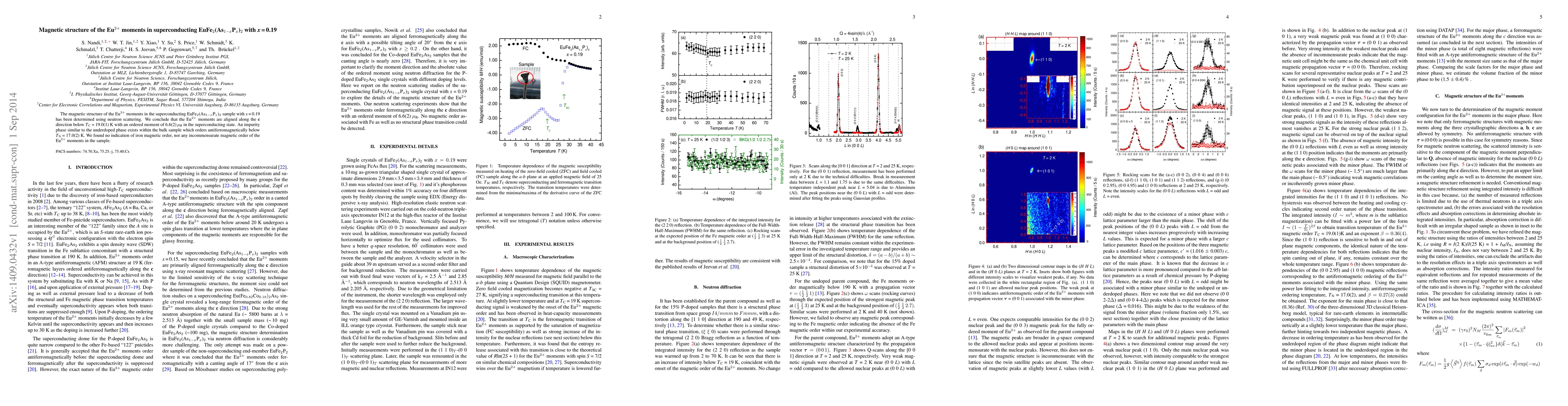 The magnetic structure of the Eu2+ moments in the superconducting EuFe2(As1-xPx)2 sample with x = 0.19 has been determined using neutron scattering. We conclude that the Eu2+ moments are aligned along the c direction below T_C = 19.0(1) K with an ordered moment of 6.6(2) mu_B in the superconducting state. An impurity phase similar to the underdoped phase exists within the bulk sample which orders antiferromagnetically below T_N = 17.0(2) K. We found no indication of iron magnetic order, nor any incommensurate magnetic order of the Eu2+ moments in the sample.