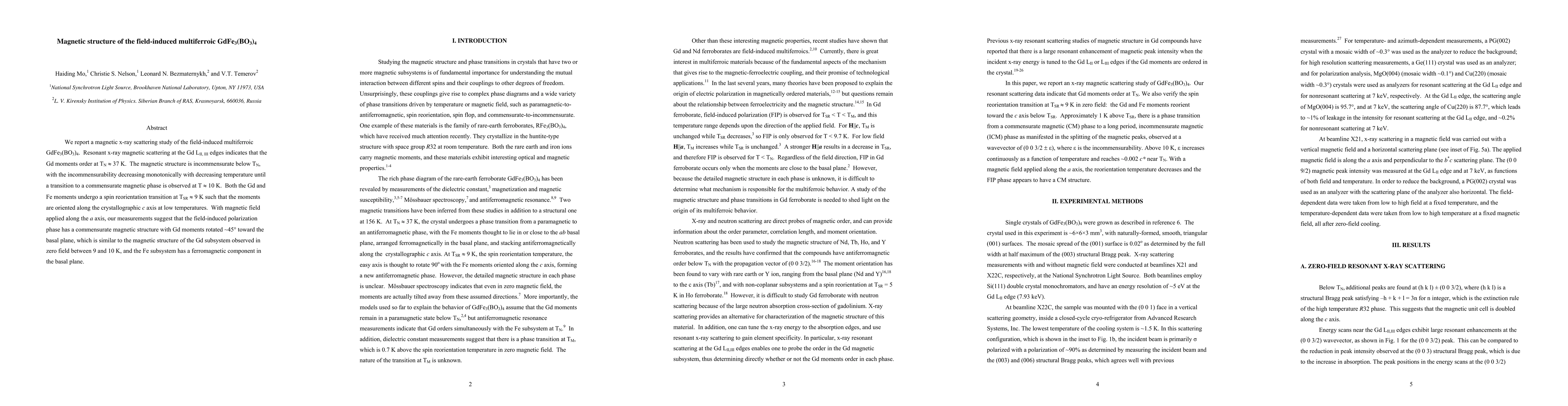 We report a magnetic x-ray scattering study of the field-induced multiferroic GdFe3(BO3)4. Resonant x-ray magnetic scattering at the Gd LII,III edges indicates that the Gd moments order at TN ~ 37 K. The magnetic structure is incommensurate below TN, with the incommensurability decreasing monotonically with decreasing temperature until a transition to a commensurate magnetic phase is observed at T ~ 10 K. Both the Gd and Fe moments undergo a spin reorientation transition at TSR ~ 9 K such that the moments are oriented along the crystallographic c axis at low temperatures. With magnetic field applied along the a axis, our measurements suggest that the field-induced polarization phase has a commensurate magnetic structure with Gd moments rotated ~45 degrees toward the basal plane, which is similar to the magnetic structure of the Gd subsystem observed in zero field between 9 and 10 K, and the Fe subsystem has a ferromagnetic component in the basal plane.