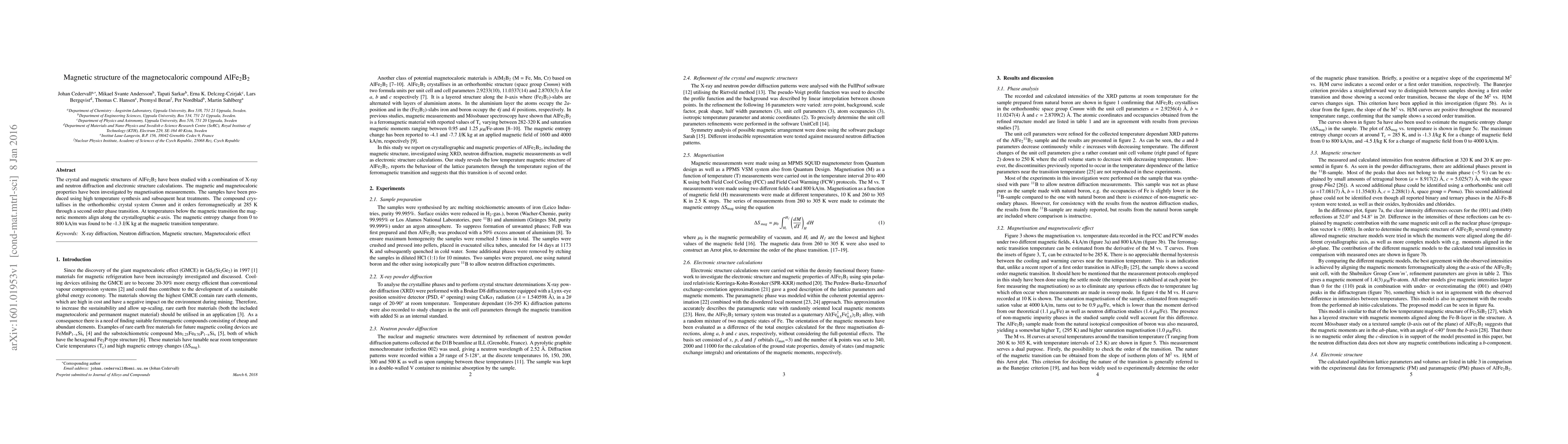 The crystal and magnetic structures of AlFe2B2 have been studied with a combination of X-ray and neutron diffraction and electronic structure calculations. The magnetic and magnetocaloric properties have been investigated by magnetisation measurements. The samples have been produced using high temperature synthesis and subsequent heat treatments. The compound crystallises in the orthorhombic crystal system Cmmm and it orders ferromagnetically at 285 K through a second order phase transition. At temperatures below the magnetic transition the magnetic moments align along the crystallographic $a$-axis. The magnetic entropy change from 0 to 800 kA/m was found to be -1.3 J/K kg at the magnetic transition temperature.