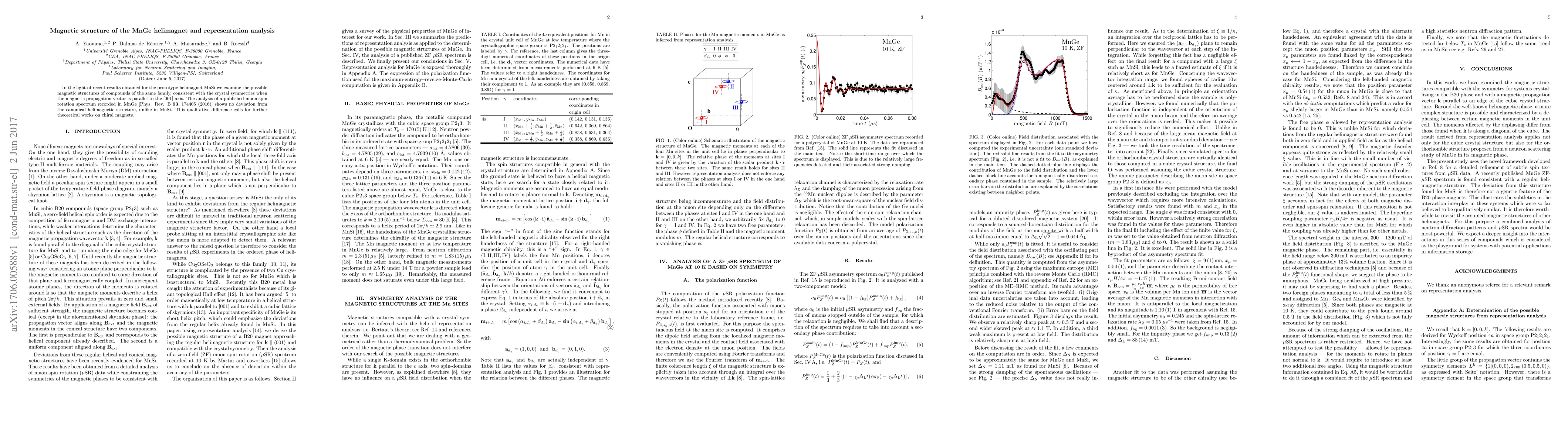 In the light of recent results obtained for the prototype helimagnet MnSi we examine the possible magnetic structures of compounds of the same family, consistent with the crystal symmetries when the magnetic propagation vector is parallel to the [001] axis. The analysis of a published muon spin rotation spectrum recorded in MnGe [Phys. Rev. B 93, 174405 (2016)] shows no deviation from the canonical helimagnetic structure, unlike in MnSi. This qualitative difference calls for further theoretical works on chiral magnets.
