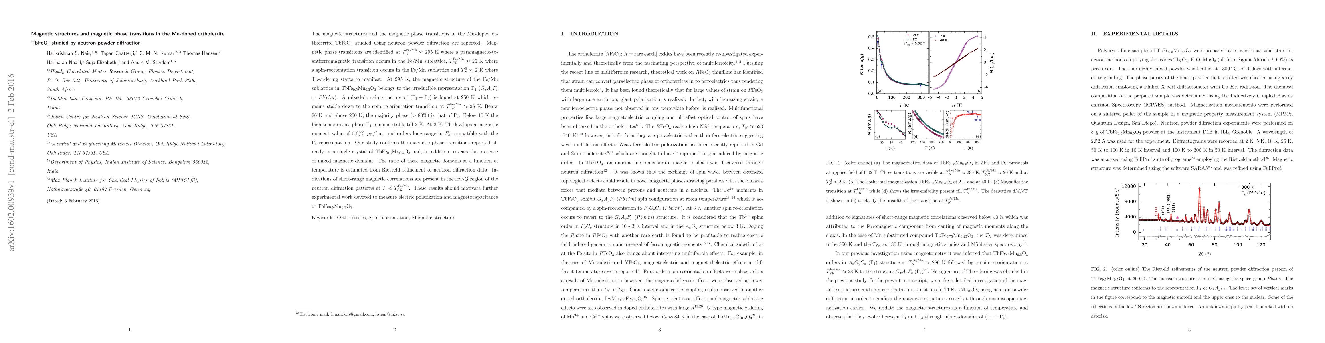 This study investigates the magnetic structures and phase transitions in Mn-doped orthoferrite TbFeO$_3$ using neutron powder diffraction, identifying transitions at 295~K, 26~K, and 2~K, and revealing a mixed-domain structure and short-range magnetic correlations.