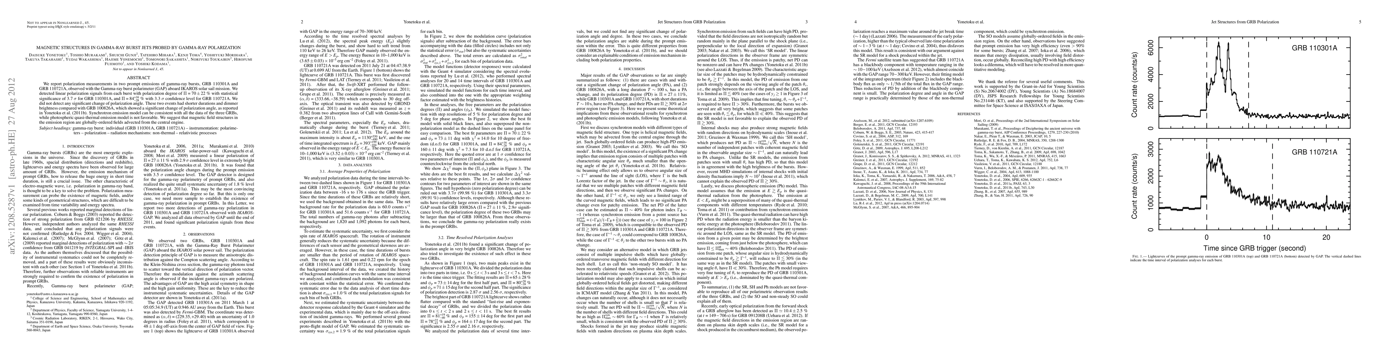 We report polarization measurements in two prompt emissions of gamma-ray bursts, GRB 110301A and GRB 110721A, observed with the Gamma-ray burst polarimeter (GAP) aboard IKAROS solar sail mission. We detected linear polarization signals from each burst with polarization degree of $\Pi = 70 \pm 22$% with statistical significance of $3.7 \sigma$ for GRB 110301A, and $\Pi = 84^{+16}_{-28}$% with $3.3 \sigma$ confidence level for GRB 110721A. We did not detect any significant change of polarization angle. These two events had shorter durations and dimmer brightness compared with GRB 100826A, which showed a significant change of polarization angle, as reported in Yonetoku et al. (2011). Synchrotron emission model can be consistent with all the data of the three GRBs, while photospheric quasi-thermal emission model is not favorable. We suggest that magnetic field structures in the emission region are globally-ordered fields advected from the central engine.