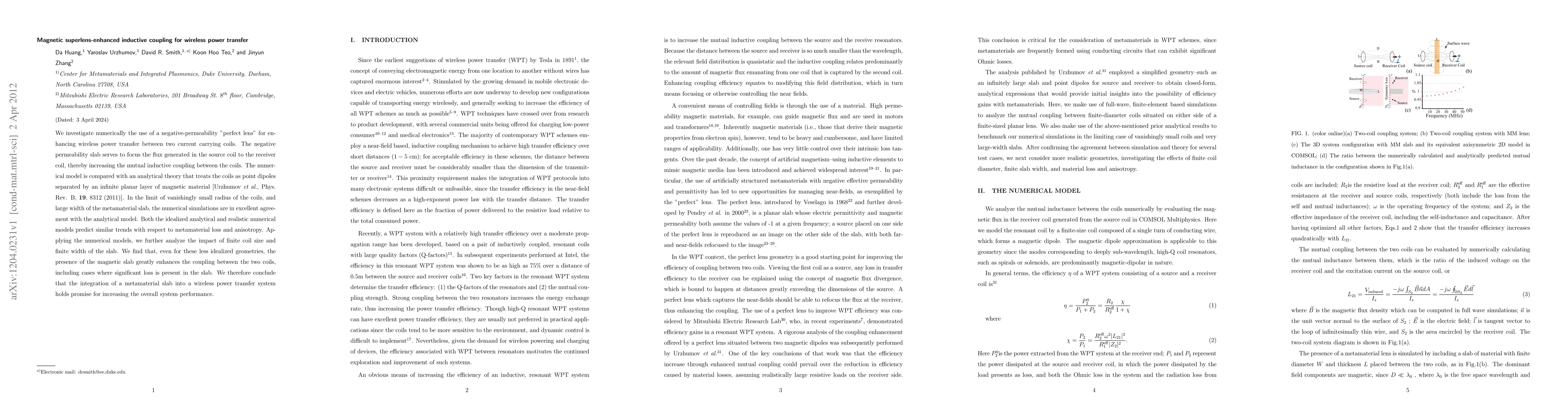 We investigate numerically the use of a negative-permeability "perfect lens" for enhancing wireless power transfer between two current carrying coils. The negative permeability slab serves to focus the flux generated in the source coil to the receiver coil, thereby increasing the mutual inductive coupling between the coils. The numerical model is compared with an analytical theory that treats the coils as point dipoles separated by an infinite planar layer of magnetic material [Urzhumov et al., Phys. Rev. B, 19, 8312 (2011)]. In the limit of vanishingly small radius of the coils, and large width of the metamaterial slab, the numerical simulations are in excellent agreement with the analytical model. Both the idealized analytical and realistic numerical models predict similar trends with respect to metamaterial loss and anisotropy. Applying the numerical models, we further analyze the impact of finite coil size and finite width of the slab. We find that, even for these less idealized geometries, the presence of the magnetic slab greatly enhances the coupling between the two coils, including cases where significant loss is present in the slab. We therefore conclude that the integration of a metamaterial slab into a wireless power transfer system holds promise for increasing the overall system performance.