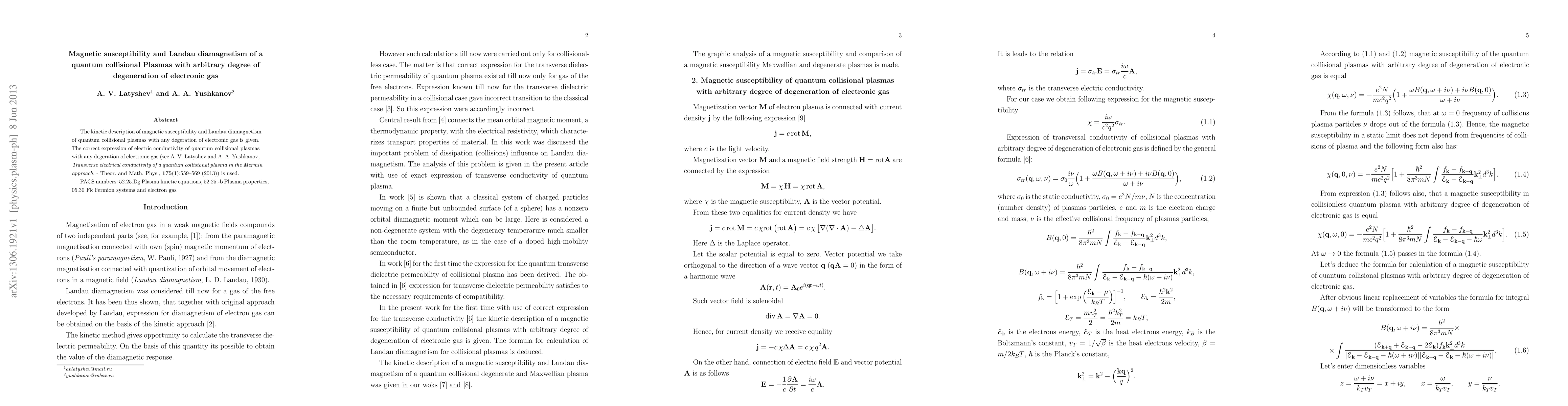 This paper investigates the magnetic susceptibility and Landau diamagnetism in quantum collisional plasmas with varying degrees of electronic gas degeneration, employing a kinetic description and the correct expression for electric conductivity from prior work.