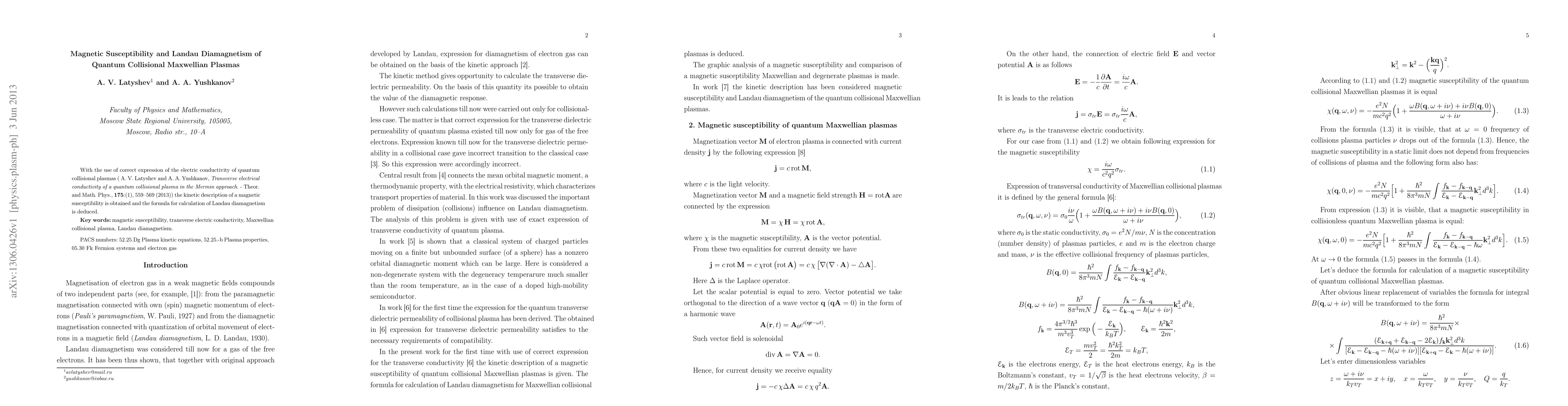 This paper derives the magnetic susceptibility and formulates Landau diamagnetism for quantum collisional Maxwellian plasmas using the accurate expression of electric conductivity from Latyshev and Yushkanov. The study provides a kinetic description and a new formula for calculating Landau diamagnetism.