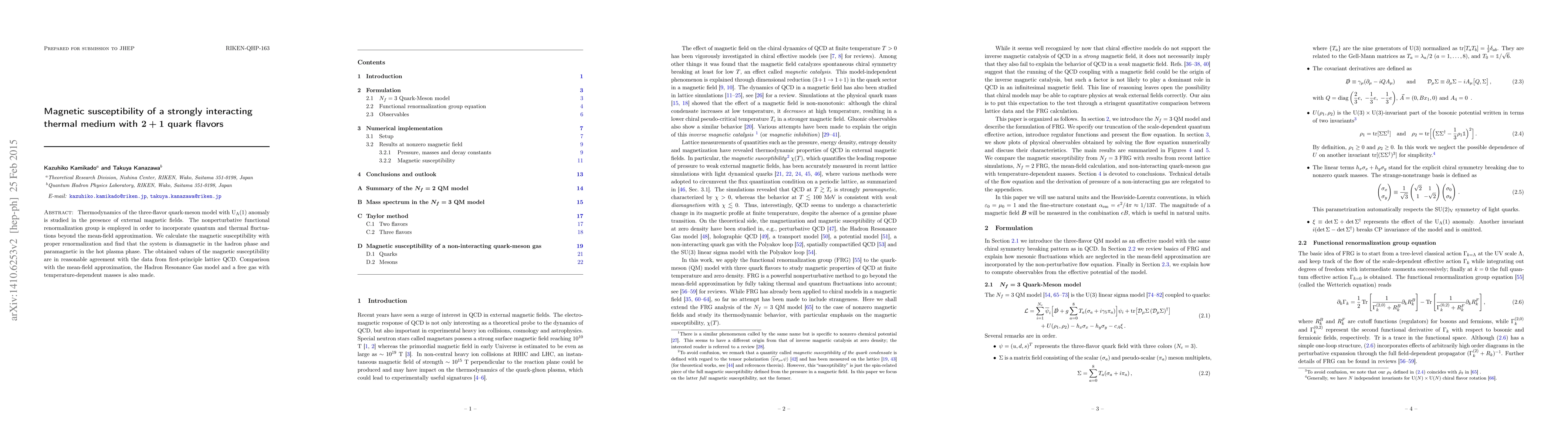 Thermodynamics of the three-flavor quark-meson model with axial anomaly is studied in the presence of external magnetic fields. The nonperturbative functional renormalization group is employed in order to incorporate quantum and thermal fluctuations beyond the mean-field approximation. We calculate the magnetic susceptibility with proper renormalization and find that the system is diamagnetic in the hadron phase and paramagnetic in the hot plasma phase. The obtained values of the magnetic susceptibility are in reasonable agreement with the data from first-principle lattice QCD. Comparison with the mean-field approximation, the Hadron Resonance Gas model and a free gas with temperature-dependent masses is also made.