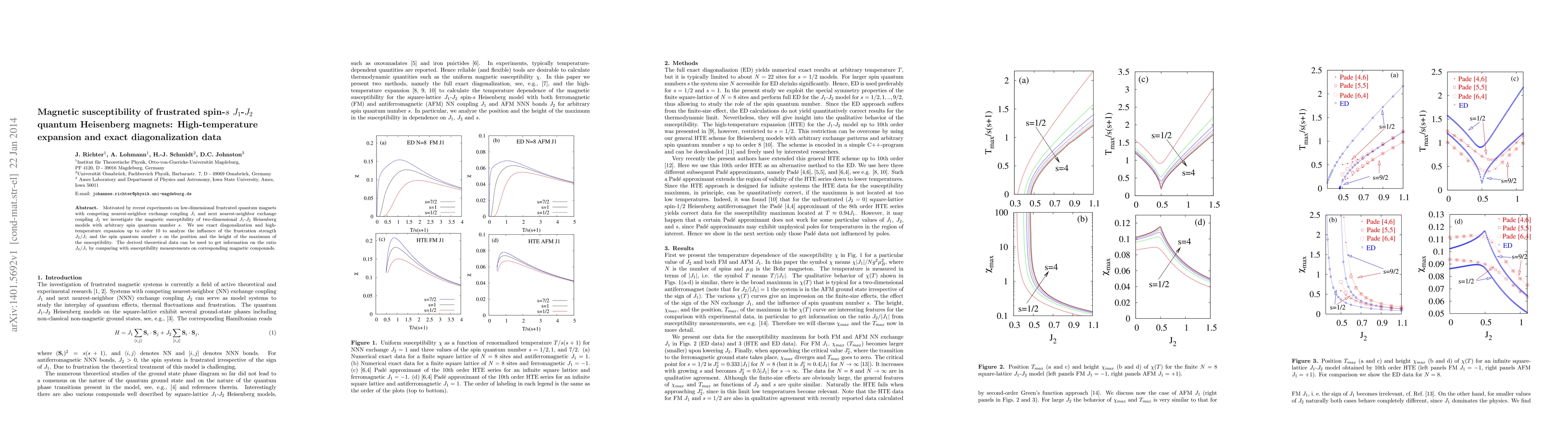This paper investigates the magnetic susceptibility of two-dimensional J1-J2 Heisenberg models using exact diagonalization and high-temperature expansion. The study reveals how the ratio J2/J1 and spin quantum number s affect the susceptibility peak, providing a theoretical framework for interpreting experimental data on frustrated quantum magnets.