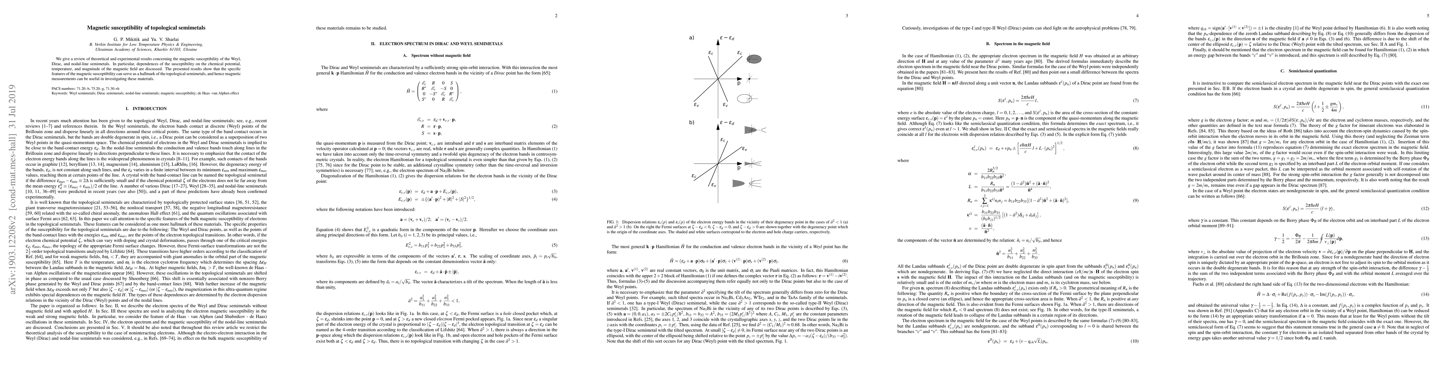 We give a review of theoretical and experimental results concerning the magnetic susceptibility of the Weyl, Dirac, and nodal-line semimetals. In particular, dependences of the susceptibility on the chemical potential, temperature, and magnitude of the magnetic field are discussed. The presented results show that the specific features of the magnetic susceptibility can serve as a hallmark of the topological semimetals, and hence magnetic measurements can be useful in investigating these materials.