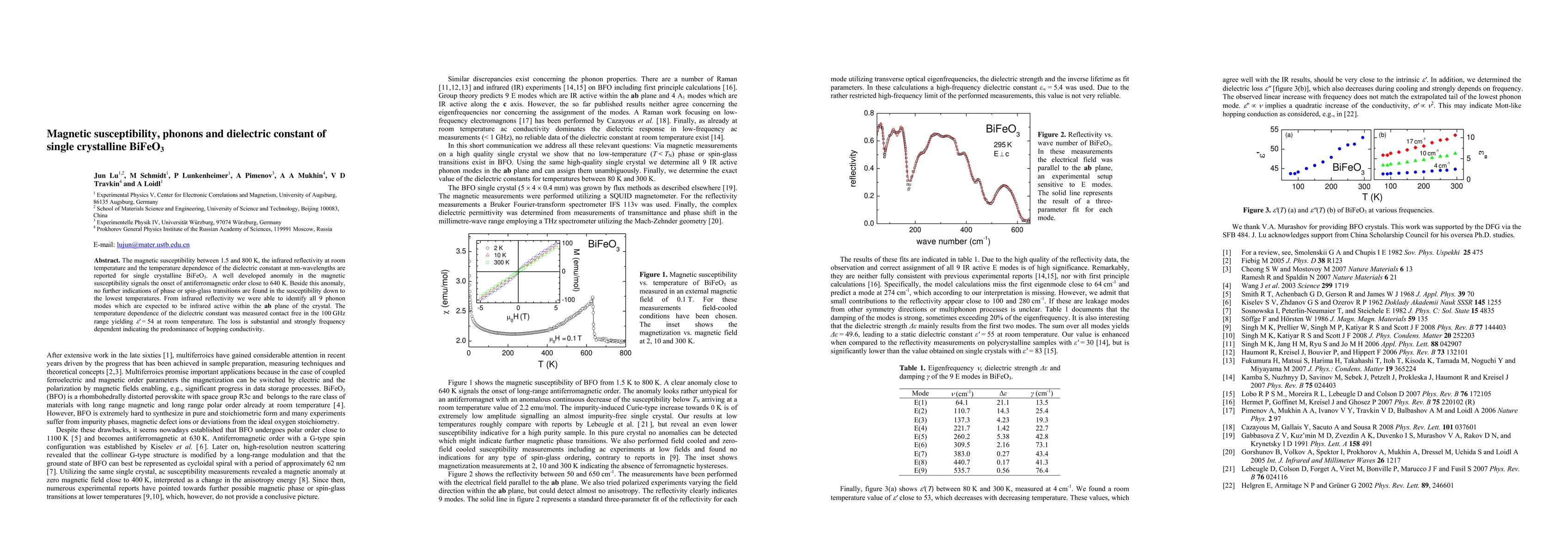 The magnetic susceptibility between 1.5 and 800 K, the infrared reflectivity at room temperature and the temperature dependence of the dielectric constant at mm-wavelengths are reported for single crystalline BiFeO3. A well developed anomaly in the magnetic susceptibility signals the onset of antiferromagnetic order close to 640 K. Beside this anomaly, no further indications of phase or spin-glass transitions are found in the susceptibility down to the lowest temperatures. From infrared reflectivity we were able to identify all 9 phonon modes which are expected to be infrared active within the ab plane of the crystal. The temperature dependence of the dielectric constant was measured contact free in the 100 GHz range yielding e' = 54 at room temperature. The loss is substantial and strongly frequency dependent indicating the predominance of hopping conductivity.