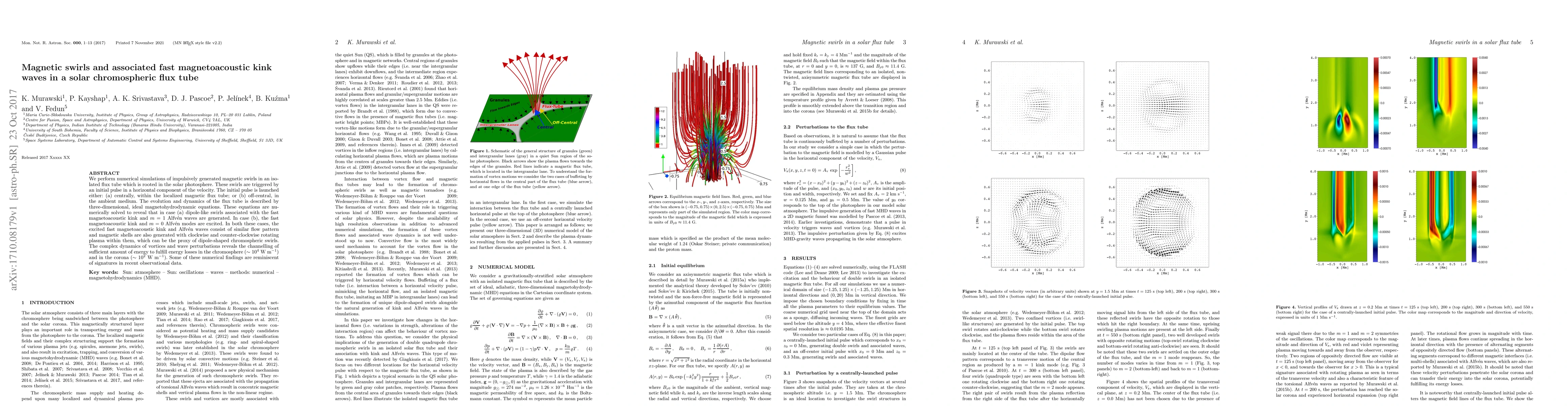 This paper investigates the dynamics of magnetic swirls and associated fast magnetoacoustic kink waves in a solar chromospheric flux tube using numerical simulations. The study reveals that dipole-like swirls and Alfvén waves are generated depending on whether the initial pulse is applied centrally within the flux tube or off-centrally in the ambient medium, with implications for chromospheric and coronal energy losses.