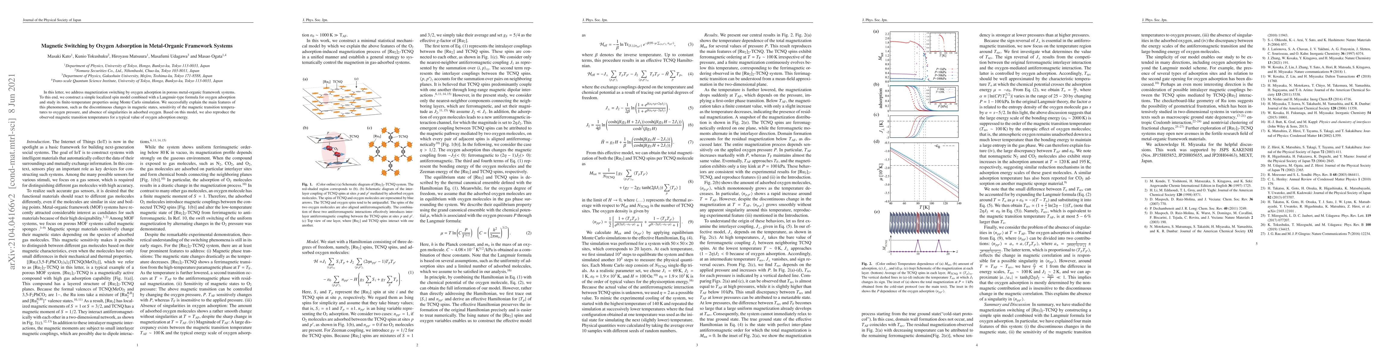 This research introduces a model explaining magnetization switching in metal-organic frameworks via oxygen adsorption, using a localized spin model and Monte Carlo simulations. The findings demonstrate discontinuous magnetic state changes, pressure-sensitive transition temperatures, and absence of singularities in adsorbed oxygen, accurately reproducing observed temperatures.