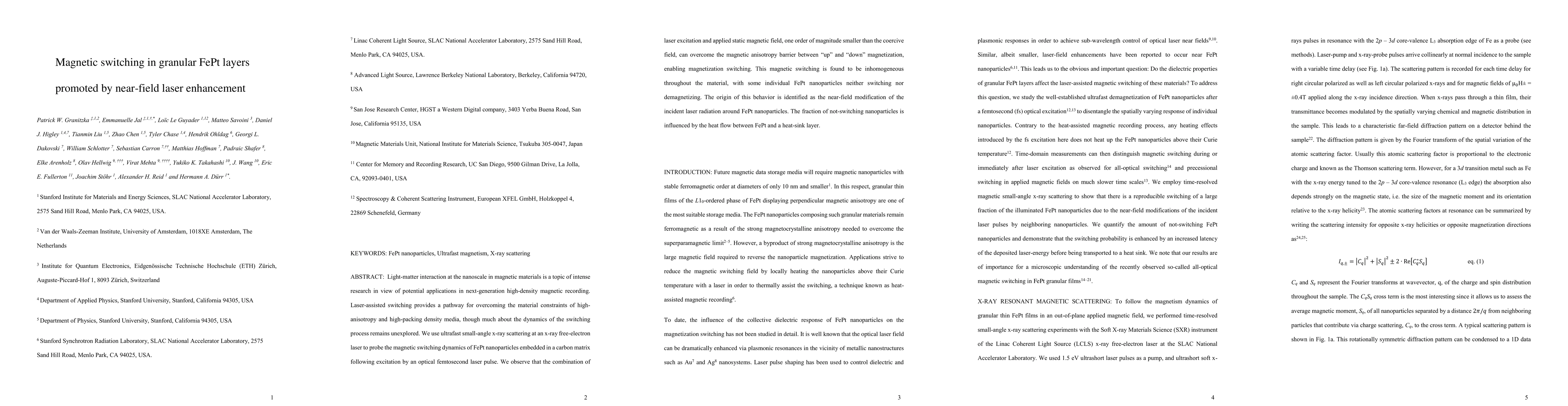 This paper investigates laser-assisted magnetic switching in FePt granular layers using ultrafast x-ray scattering, revealing that near-field laser enhancement can overcome magnetic anisotropy barriers, though inhomogeneous switching occurs due to variations in laser near-field effects and heat flow between nanoparticles and surrounding layers.