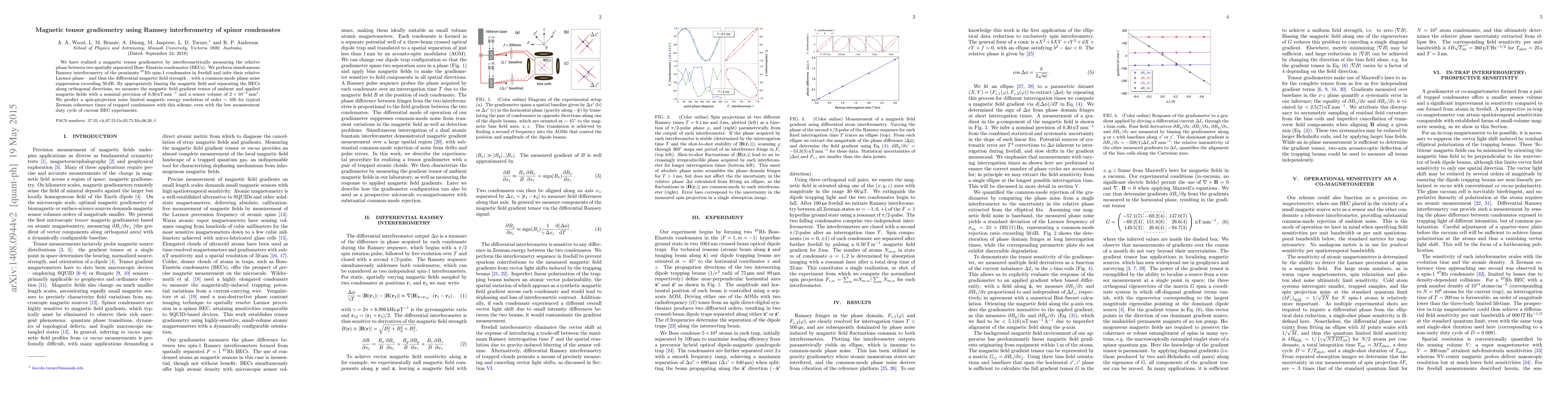 This paper describes the development of a magnetic tensor gradiometer using Ramsey interferometry of spin-1 $^{87}$Rb Bose-Einstein condensates, achieving a magnetic field gradient measurement precision of $30\,\mathrm{\mu G\,cm^{-1}}$ with a sensor volume of $2\times10^{-5}\,\mathrm{mm}^3$. The method suppresses common-mode phase noise by over $50\,\mathrm{dB}$.