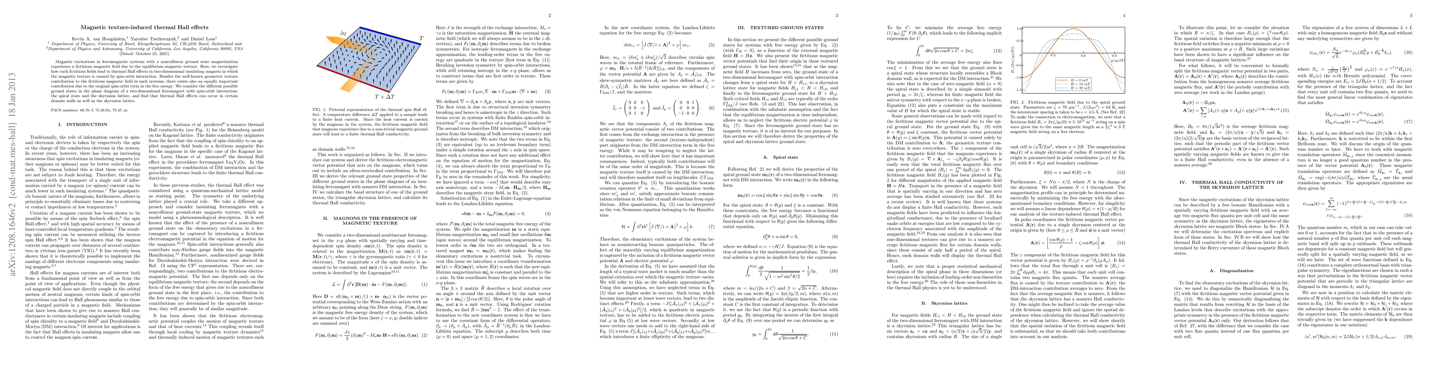 Magnetic excitations in ferromagnetic systems with a noncollinear ground state magnetization experience a fictitious magnetic field due to the equilibrium magnetic texture. Here, we investigate how such fictitious fields lead to thermal Hall effects in two-dimensional insulating magnets in which the magnetic texture is caused by spin-orbit interaction. Besides the well-known geometric texture contribution to the fictitious magnetic field in such systems, there exists also an equally important contribution due to the original spin-orbit term in the free energy. We consider the different possible ground states in the phase diagram of a two-dimensional ferromagnet with spin-orbit interaction: the spiral state and the skyrmion lattice, and find that thermal Hall effects can occur in certain domain walls as well as the skyrmion lattice.