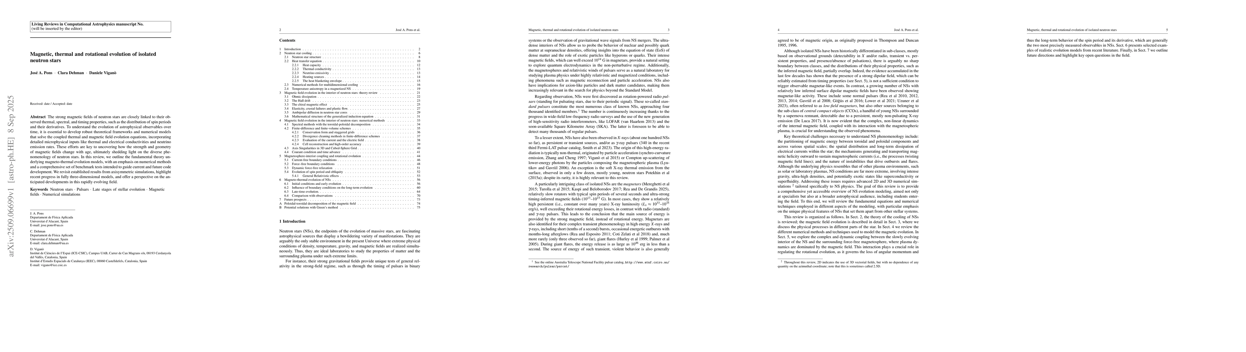 The strong magnetic fields of neutron stars are closely linked to their observed thermal, spectral, and timing properties, such as the distribution of spin periods and their derivatives. To understand the evolution of astrophysical observables over time, it is essential to develop robust theoretical frameworks and numerical models that solve the coupled thermal and magnetic field evolution equations, incorporating detailed microphysical inputs like thermal and electrical conductivities and neutrino emission rates. These efforts are key to uncovering how the strength and geometry of magnetic fields change with age, ultimately shedding light on the diverse phenomenology of neutron stars. In this review, we outline the fundamental theory underlying magneto-thermal evolution models, with an emphasis on numerical methods and a comprehensive set of benchmark tests intended to guide current and future code development. We revisit established results from axisymmetric simulations, highlight recent progress in fully three-dimensional models, and offer a perspective on the anticipated developments in this rapidly evolving field.