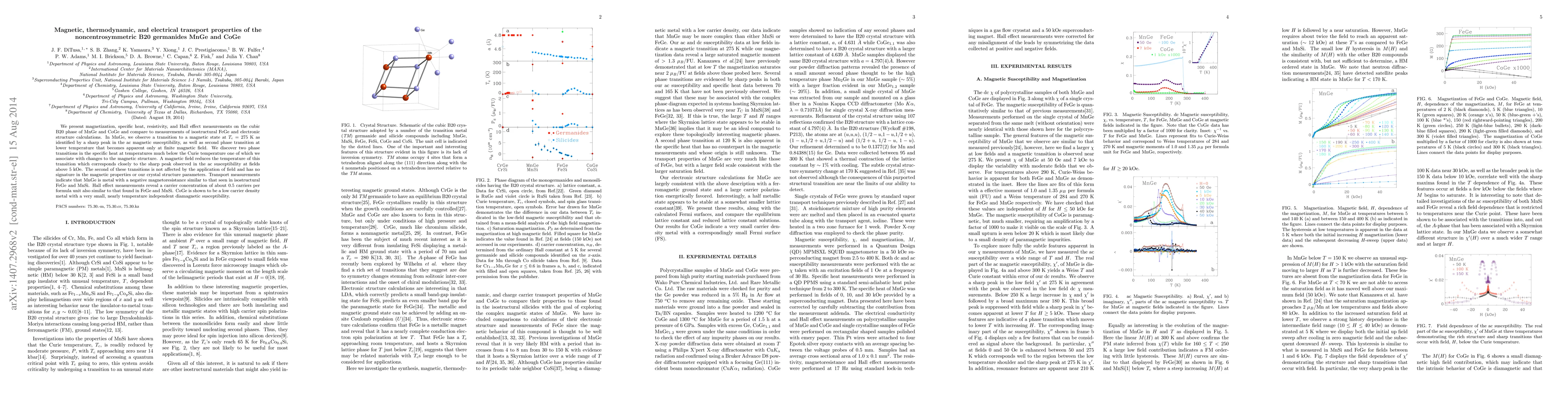 We present magnetization, specific heat, resistivity, and Hall effect measurements on the cubic B20 phase of MnGe and CoGe and compare to measurements of isostructural FeGe and electronic structure calculations. In MnGe, we observe a transition to a magnetic state at $T_c=275$ K as identified by a sharp peak in the ac magnetic susceptibility, as well as second phase transition at lower temperature that becomes apparent only at finite magnetic field. We discover two phase transitions in the specific heat at temperatures much below the Curie temperature one of which we associate with changes to the magnetic structure. A magnetic field reduces the temperature of this transition which corresponds closely to the sharp peak observed in the ac susceptibility at fields above 5 kOe. The second of these transitions is not affected by the application of field and has no signature in the magnetic properties or our crystal structure parameters. Transport measurements indicate that MnGe is metal with a negative magnetoresistance similar to that seen in isostructural FeGe and MnSi. Hall effect measurements reveal a carrier concentration of about 0.5 carriers per formula unit also similar to that found in FeGe and MnSi. CoGe is shown to be a low carrier density metal with a very small, nearly temperature independent diamagnetic susceptibility.