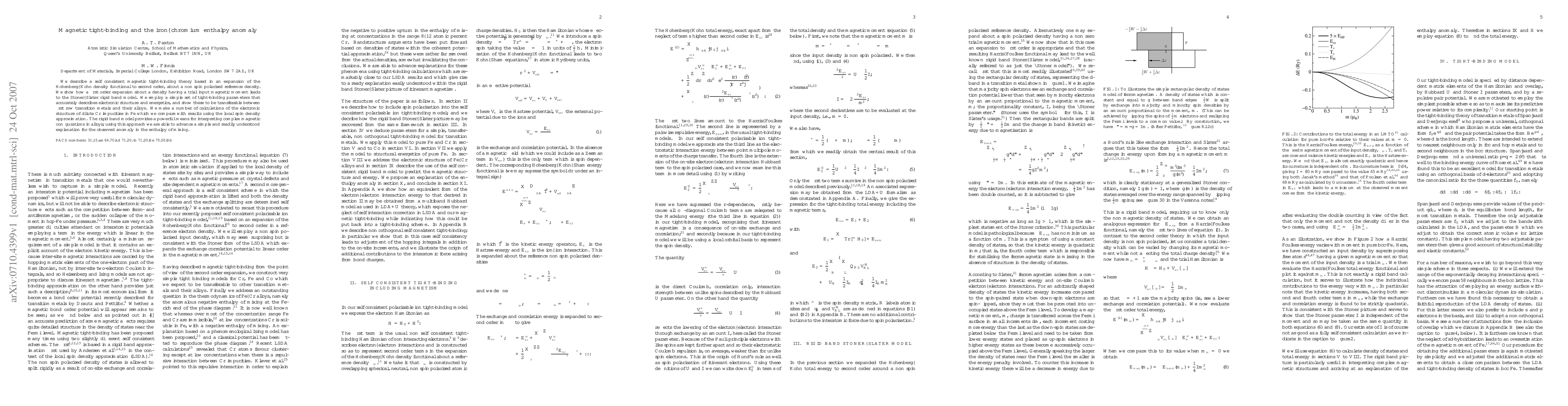 We describe a self consistent magnetic tight-binding theory based in an expansion of the Hohenberg-Kohn density functional to second order, about a non spin polarised reference density. We show how a first order expansion about a density having a trial input magnetic moment leads to the Stoner--Slater rigid band model. We employ a simple set of tight-binding parameters that accurately describes electronic structure and energetics, and show these to be transferable between first row transition metals and their alloys. We make a number of calculations of the electronic structure of dilute Cr impurities in Fe which we compare with results using the local spin density approximation. The rigid band model provides a powerful means for interpreting complex magnetic configurations in alloys; using this approach we are able to advance a simple and readily understood explanation for the observed anomaly in the enthalpy of mixing.